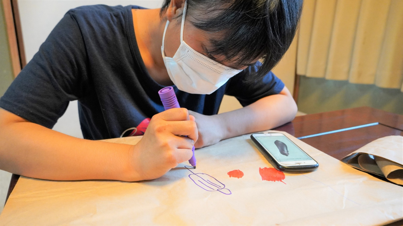 また、見本のバッグを持って受講生たちが道行く方々に積極的に声をかけたところ、「やってみたい」という子どもさんを含むお客さまが訪れてくださり、日差しを避けるテントの下で、受講生らが事前に準備したパーツを組み合わせてトートバッグに仕立て、アニメのキャラクターのシールを貼ったり、マーカーで思い思いのイラストを描いたりと、自分だけのオリジナルバッグを作っていただきました。