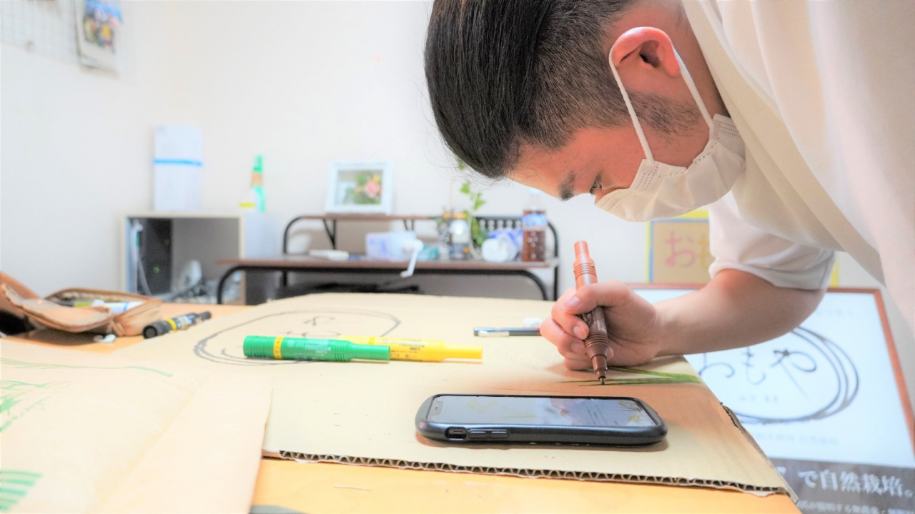 また、“おもや”では障がいをもつ方の就労支援事業も行っておられますが、この日はメンバーの和田琉聖さん、花岡咲季さん、木村圭吾さんにもお手伝いいただき、見本となるトートバックに素敵なイラストを描いてもらいました。