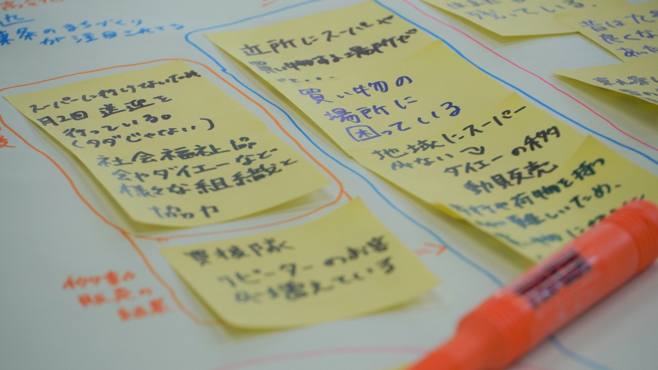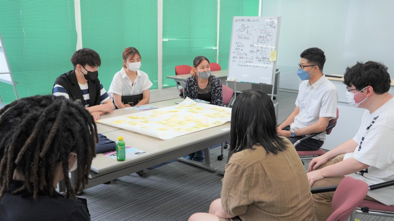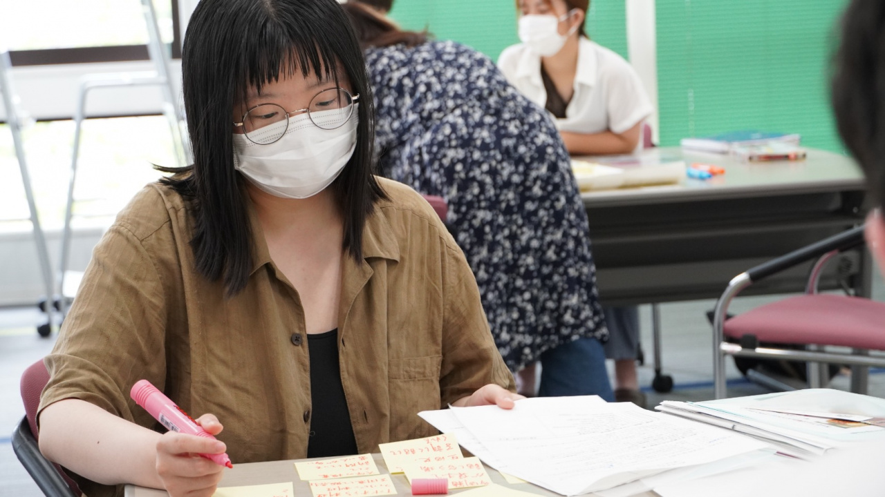 7月15日には、希望の家チームが同館に何度か訪問して得た情報や気づいたこと等を付箋に書き出して、同じ系統の付箋をグループ化してまとめた(KJ法)模造紙について、他チームにプレゼンテーションしました。