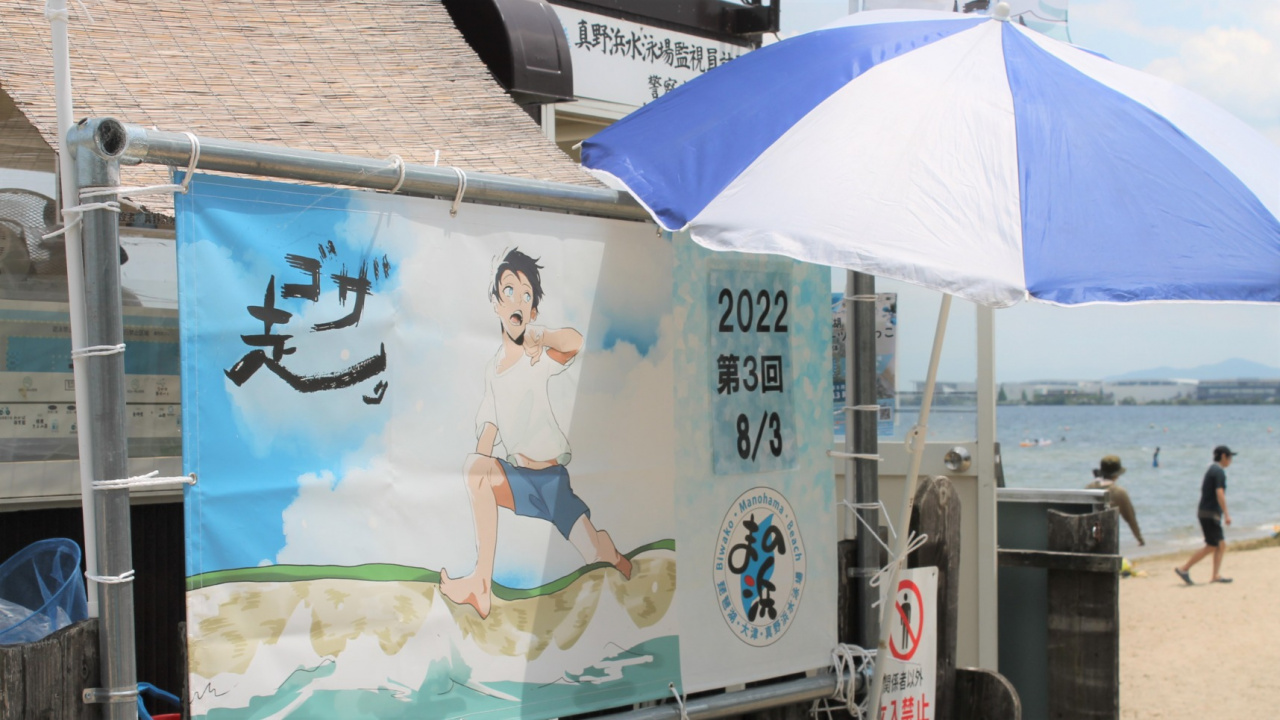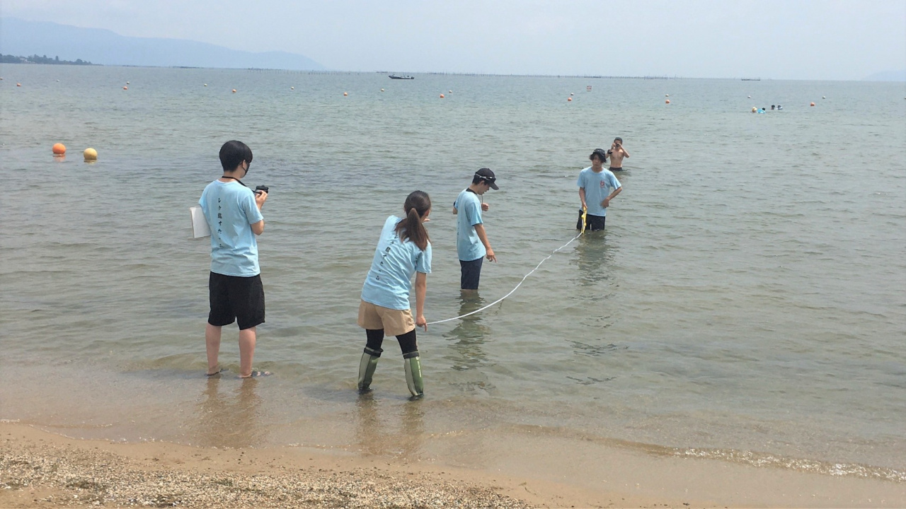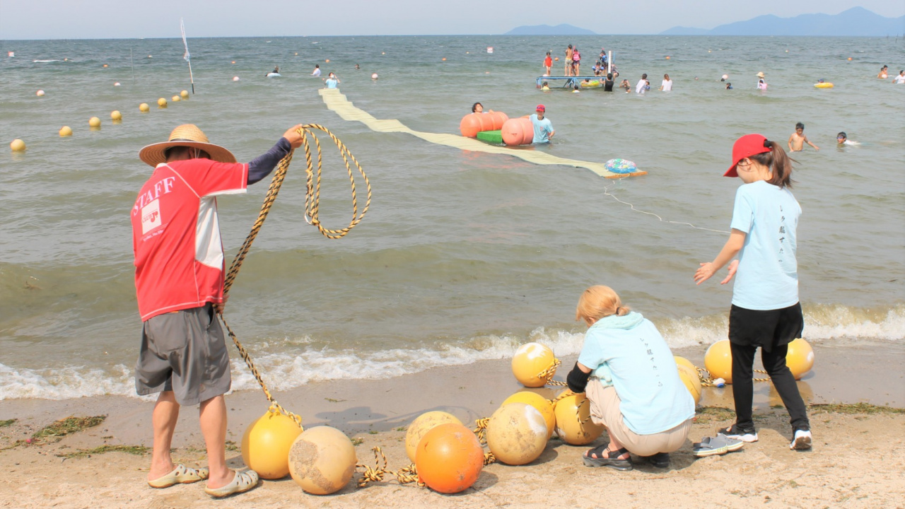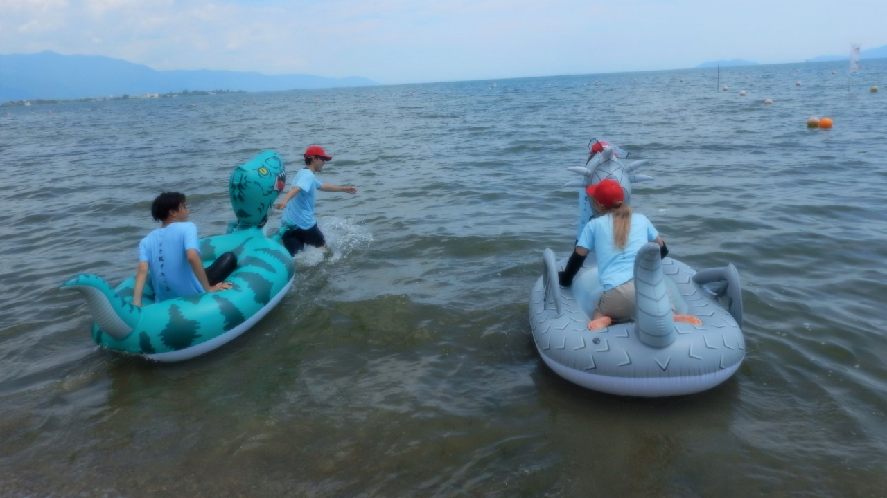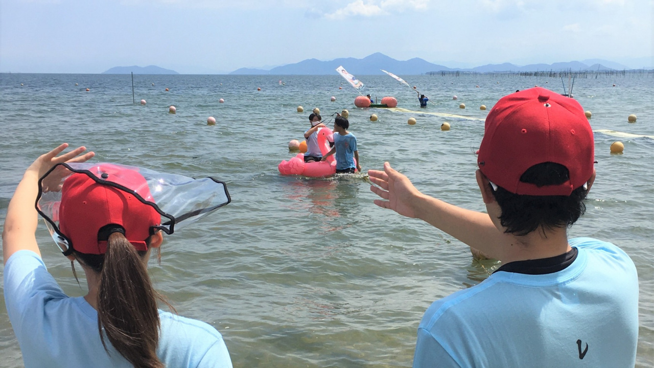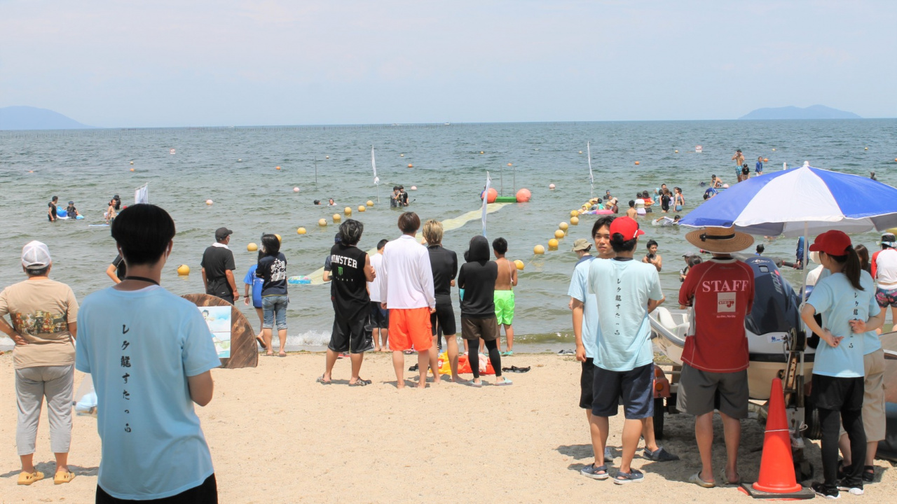 大津市の真野浜水泳場で、8月17日と25日に受講生が自分たちで考えた「浮き輪でGO!」という、人が乗れる大きな浮き輪(フロート)を引っ張って競争するイベントを企画しています。そのために、7月9日と8月3日に、同水泳場で開催されたイベント「ゴザ走り2022」に出向いて現地の視察と事業運営について、体験を通して学びました。受講生たちは本学の瀬田キャンパスがある大津市に、このような水泳場があったことに驚いていました。