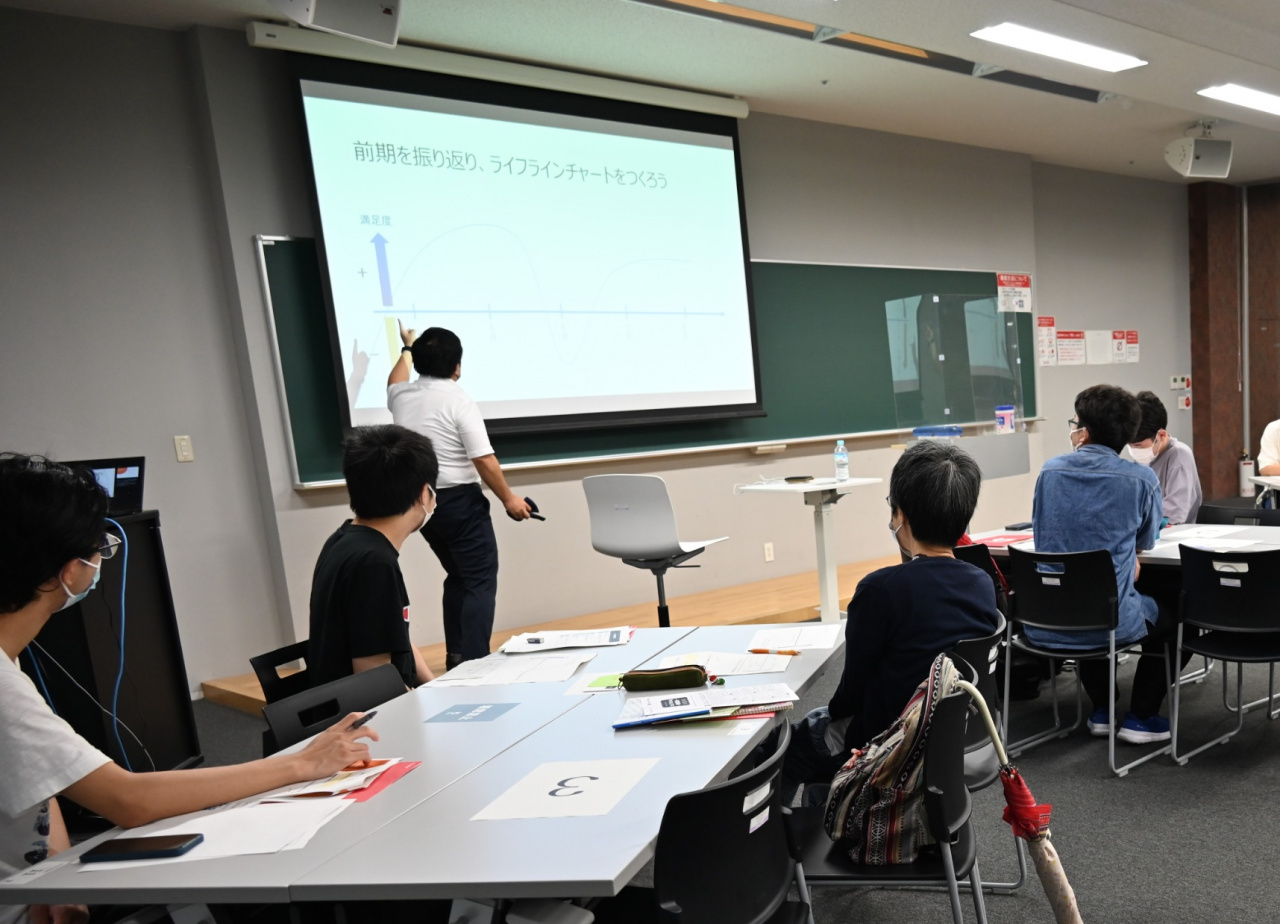 フォローアッププログラム第1回目のガイダンスを、2022年8月5日(金)に実施しました。当日は講師をお迎えし、和やかな雰囲気の中、偏愛マップの作成とグループ内でのシェア、ライフラインチャートの作成をおこない、ライフラインチャートの満足度が高いポイントに着目して、どうすればその状況を維持できるのか、考えてみました。