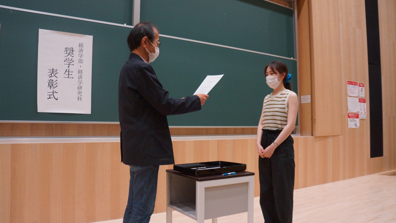 例年、表彰式は経済学部長と経済学研究科長から、奨学生一人ひとりに表彰状が手渡されますが、今年度は新型コロナウイルス感染拡大防止の観点から、各学年の代表者のみ表彰状が手渡されました。