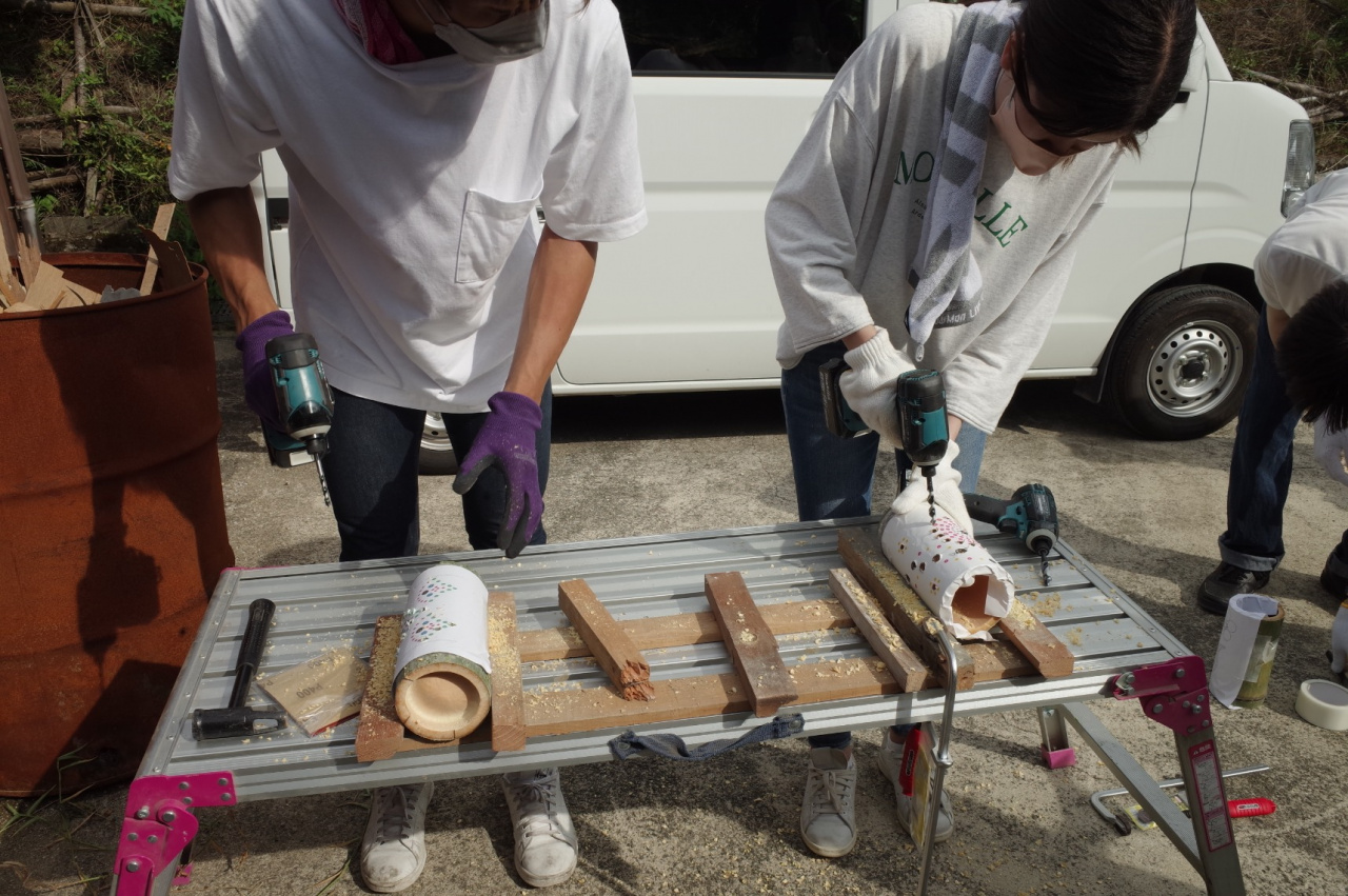 今回のフィールドワークで学生から地域住民の方々にイベントの目的と内容を説明し、10月に開催することが決定しました。準備を進めるうえでまずは竹灯籠の試作から。伐採した竹を約35センチの長さに切り、外側に図面を貼りつけ電動ドリルで穴をあけます。花や猫などさまざまな模様の竹灯籠を集落内にある「あわじ花山水」の池の周辺に置くと、あたたかい光が点々と浮かび幻想的な風景が現れました。イベント当日が楽しみです。