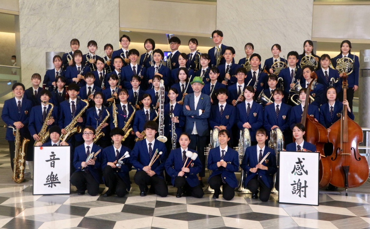 吹奏楽部は約190名の部員が在籍しており、その中から55名が部の代表として、青いブレザーを身につけて舞台に立ちました。