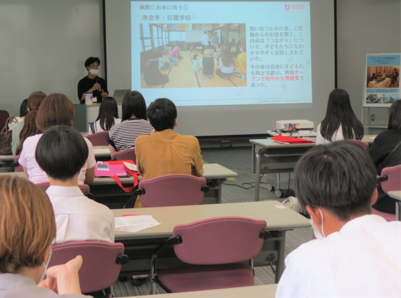 「お寺の可能性を引き出そう!―社会におけるお寺の役割を考える―」では、前期に京都府や滋賀県内にあるお寺に行き、お寺で開催されている日曜学校や食堂の取り組みにも参加しました。受講生は、お寺に対して「固い」「真面目」といったイメージを持っていましたが、意外とオープンで明るく、子どもや若者向けの活動もあるということを知ったとの気づきを発表しました。