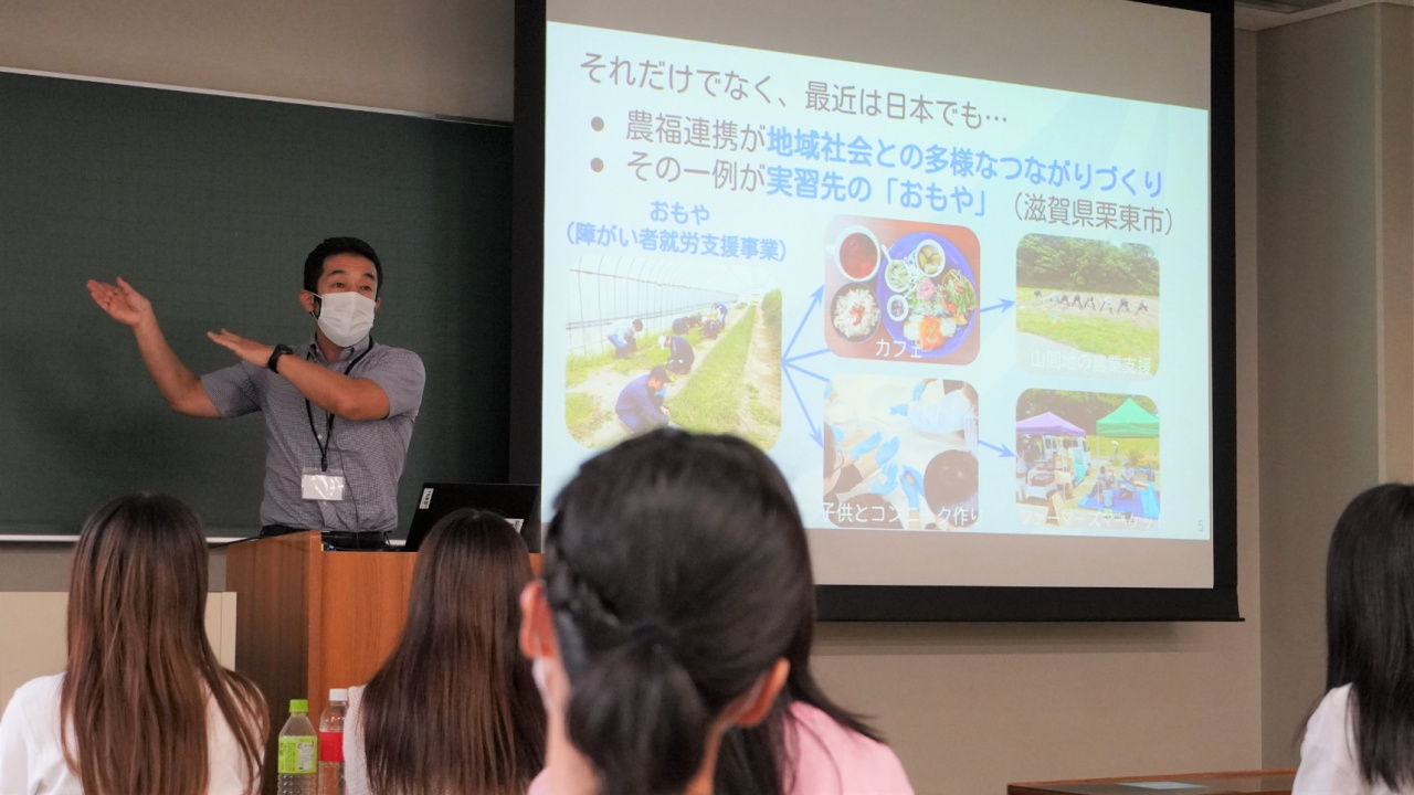 「農福連携で地域をつなぐ―「地域で誰もがいきいきと暮らせる共生社会に向けて」」では、担当教員より「農福連携」についての説明や、栗東市にある実習先「おもや」が取り組んでおられる活動、また、当該実習を受講する中で学んで欲しいスキル(社会調査と分析、企画力、他者との協働スキルなど)の紹介をした後に、具体的な活動内容を発表しました。