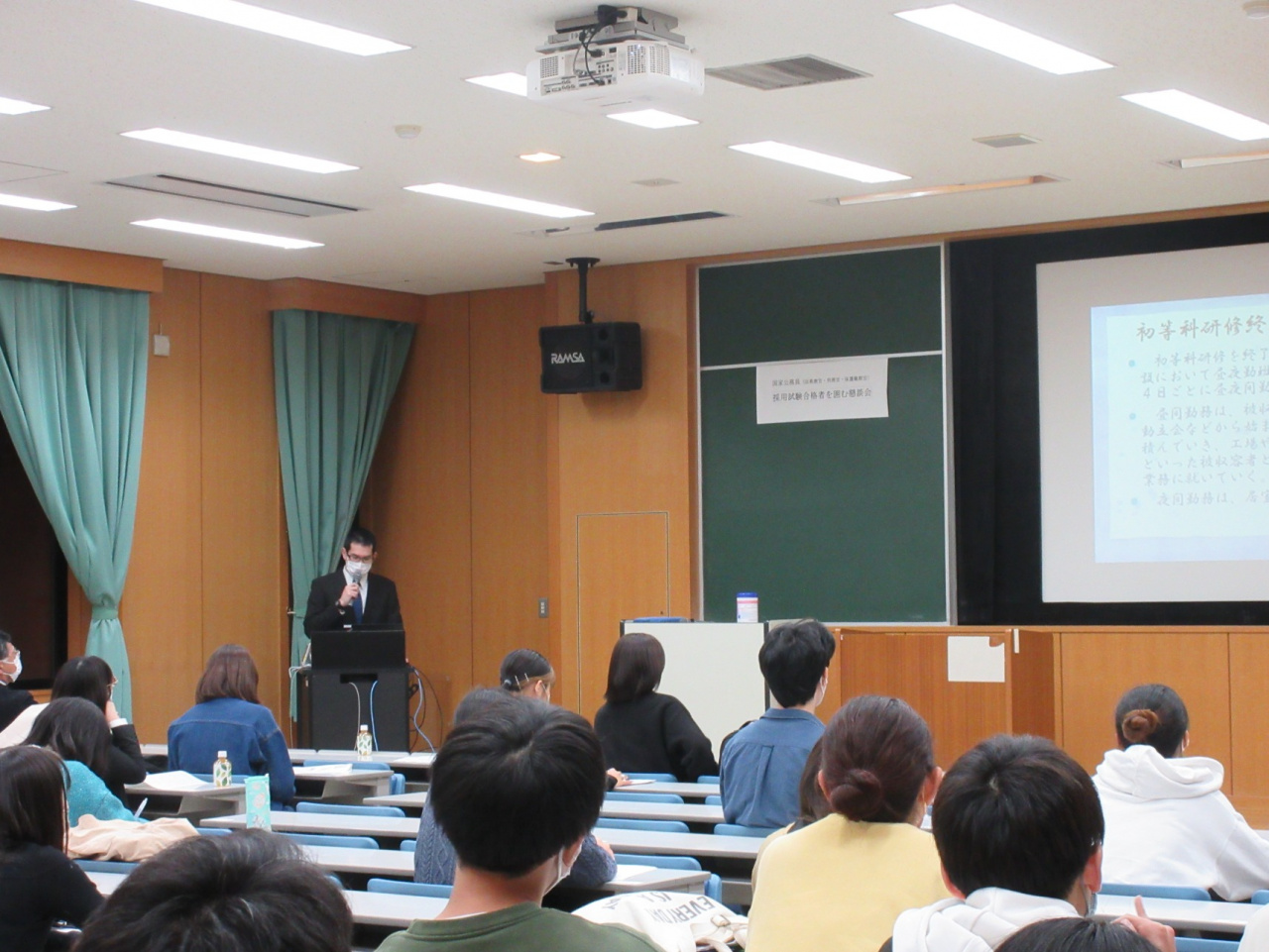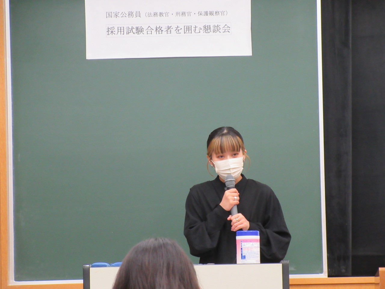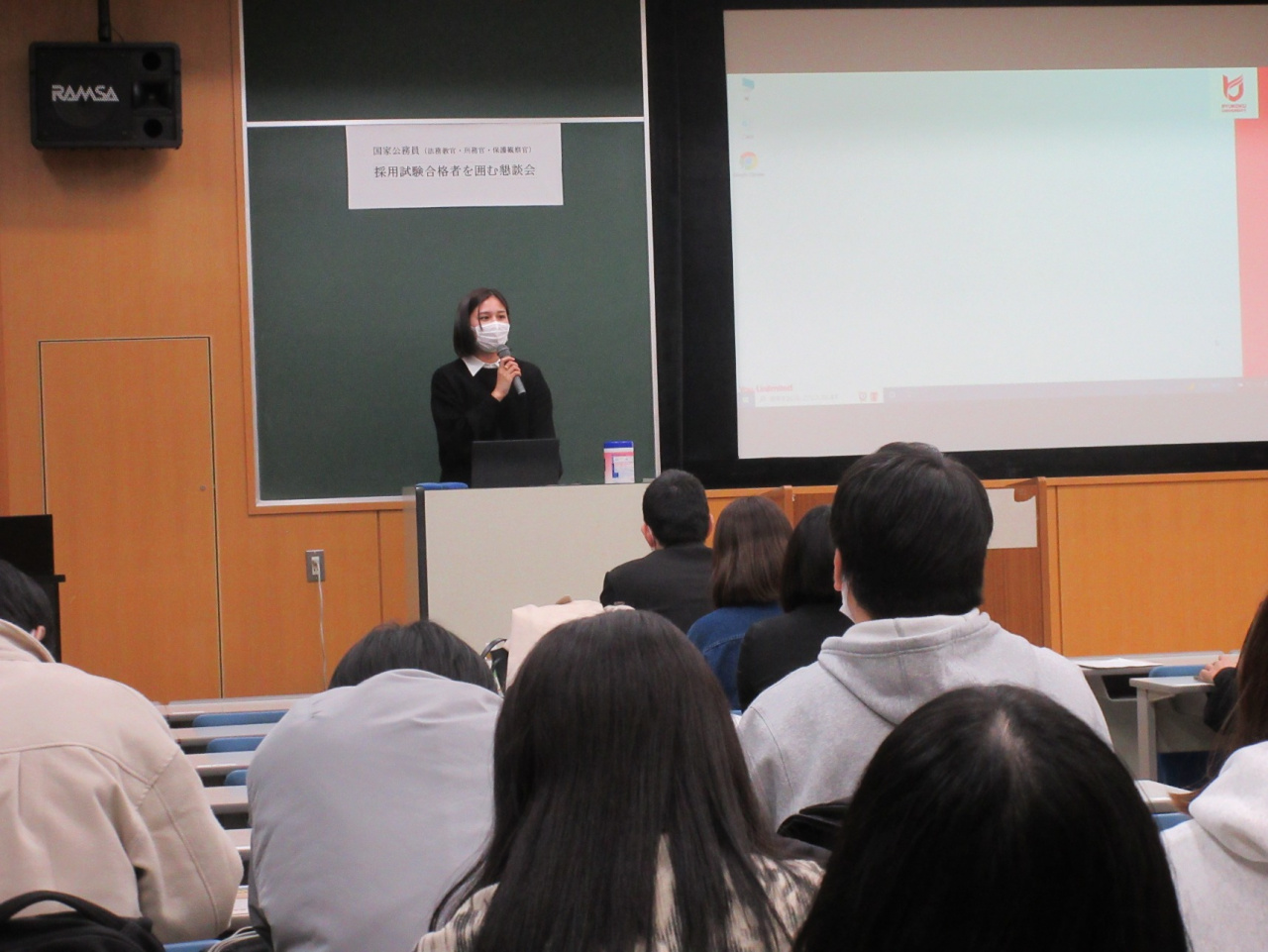 龍谷大学矯正・保護課程では、毎年度、学生のキャリア支援の一環として、本学の在学生や卒業生で、国家公務員(法務教官、刑務官、保護観察官)採用試験に合格した方や本学出身の現職の方を講師にお招きし、本課程を受講している学生らに対して、自身の合格体験談や現在の仕事内容などをお話しいただく機会として「国家公務員採用試験合格者を囲む懇談会」を開催しています。今年度もこの懇談会を11月25日(金)に開催しました。当日は40名の学生らが参加し、講師の話(アドバイス)に熱心に耳を傾けていました。懇談会終了後も残って講師に熱心に質問をする学生がたくさんいました。この中から将来採用試験の合格者がでることを期待しています。