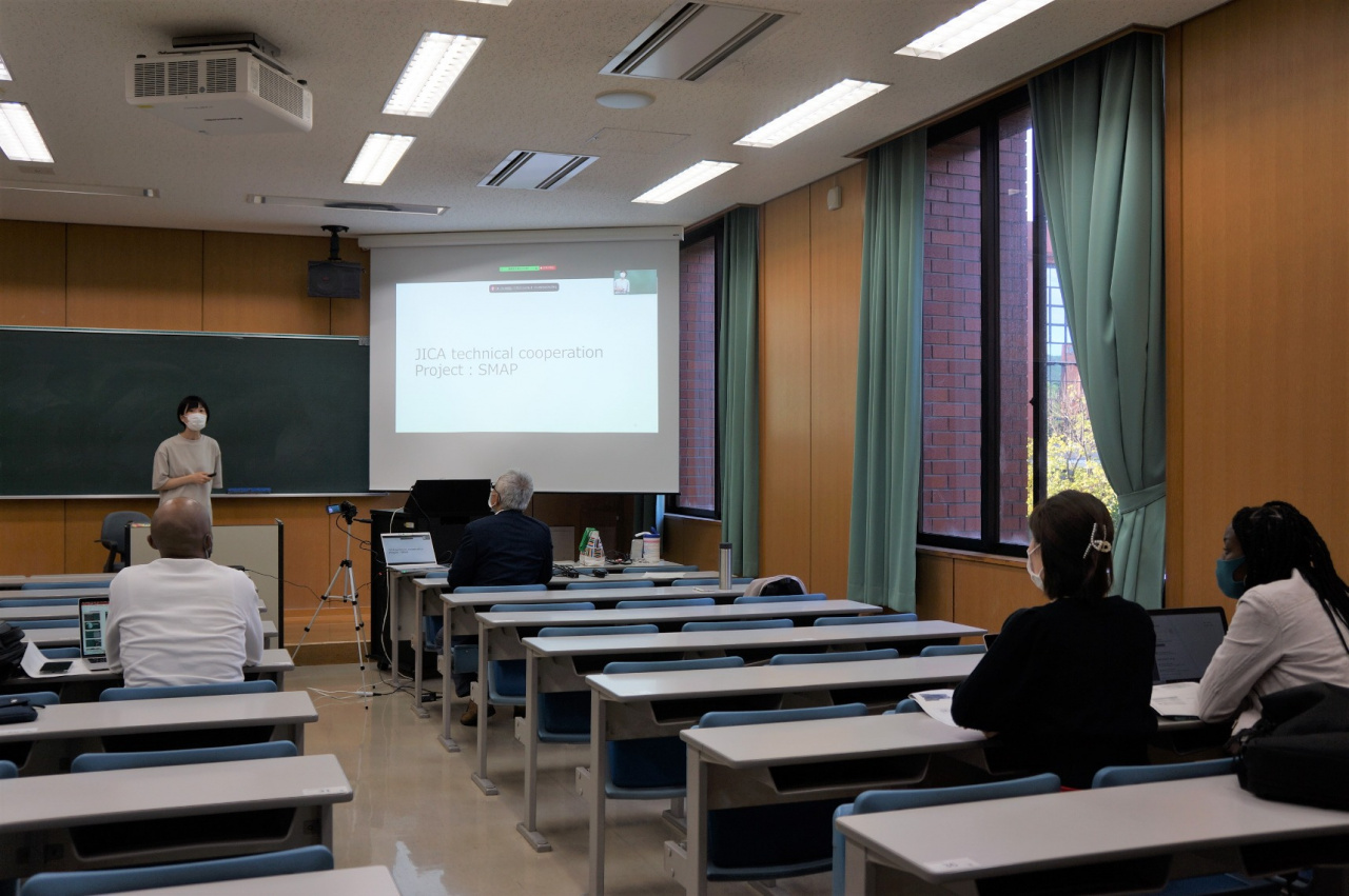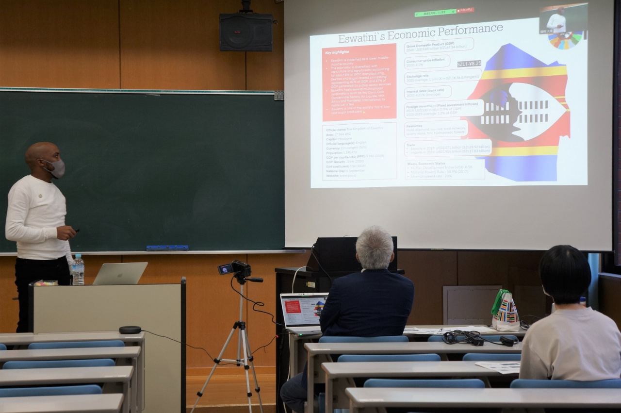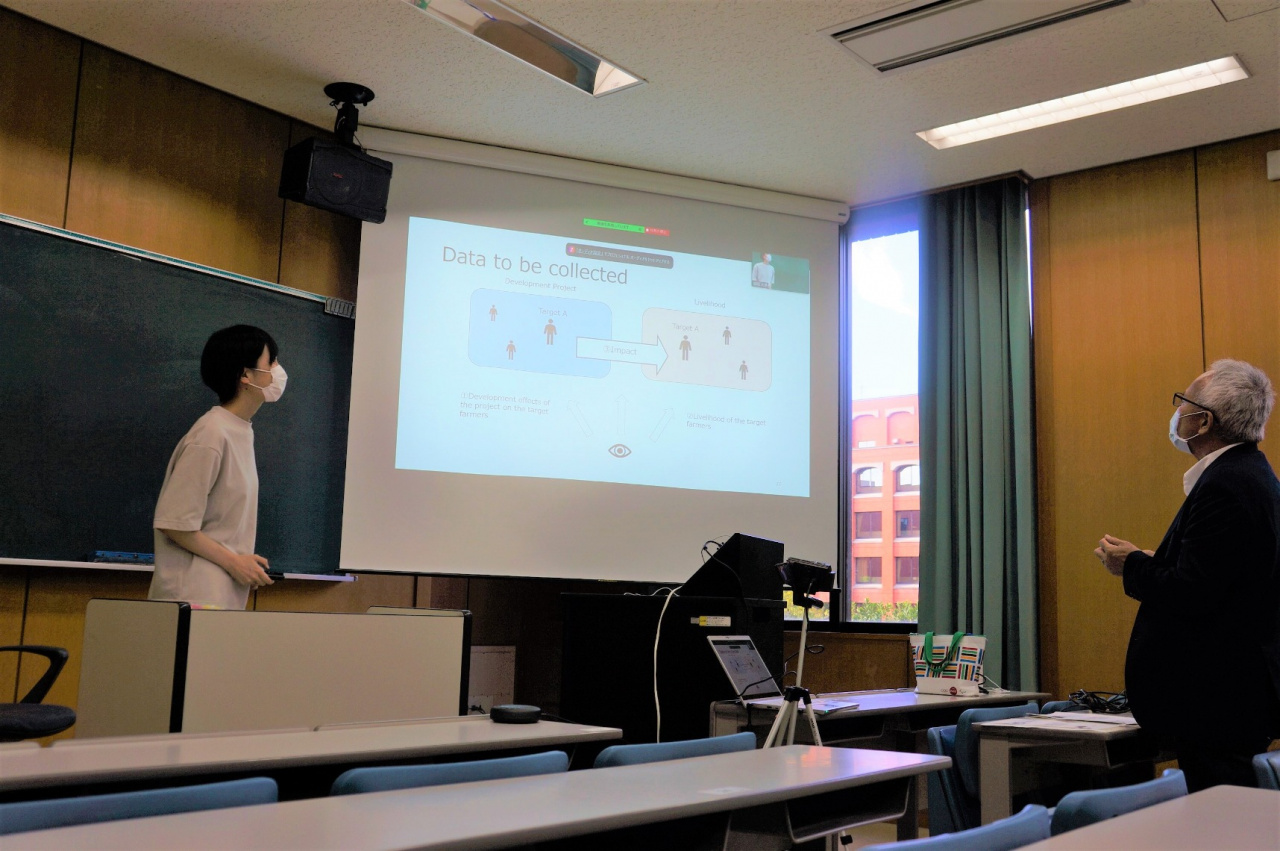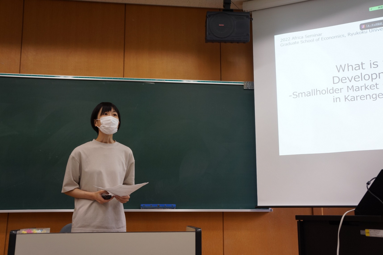 発表したのは経済学研究科修士課程2年の藤田寿乃さんと、1年のベネット・メンジさんです。藤田さんは、2022年11月よりJICAの青年海外協力隊員としてルワンダに派遣されることが決まっています。メンジさんはJICA研修員としてエスワティニ王国から4月に来日し、本研究科で学んでいます。