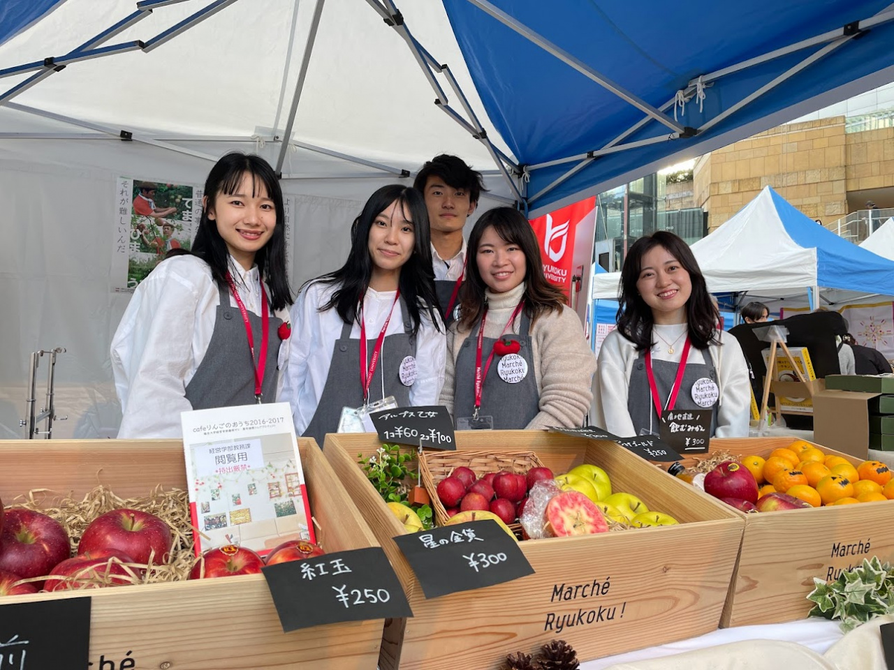 2日間に渡り藤岡ゼミが龍谷マルシェを出店しました。これまでプロジェクトを通じて連携してきた産地から送られてきた旬のりんご・みかんが木箱に並び、売り手の学生さんの笑顔と声にお客さん達が吸い寄せられ,心地よい会話が爽やかに流れていました。藤岡ゼミによるステージトークセッションの後には,ぶどう山椒を使ったゼミ開発商品「ぶどう山椒をかけて食べるカレー」「ぶどう山椒かほるマドレーヌ」「アラビアン ナッツ&スパイス」などを求める人たちで,特に賑わいを見せていました。その喜びと充実感が学生達の満面の笑顔から語らずとも伝わってきました。