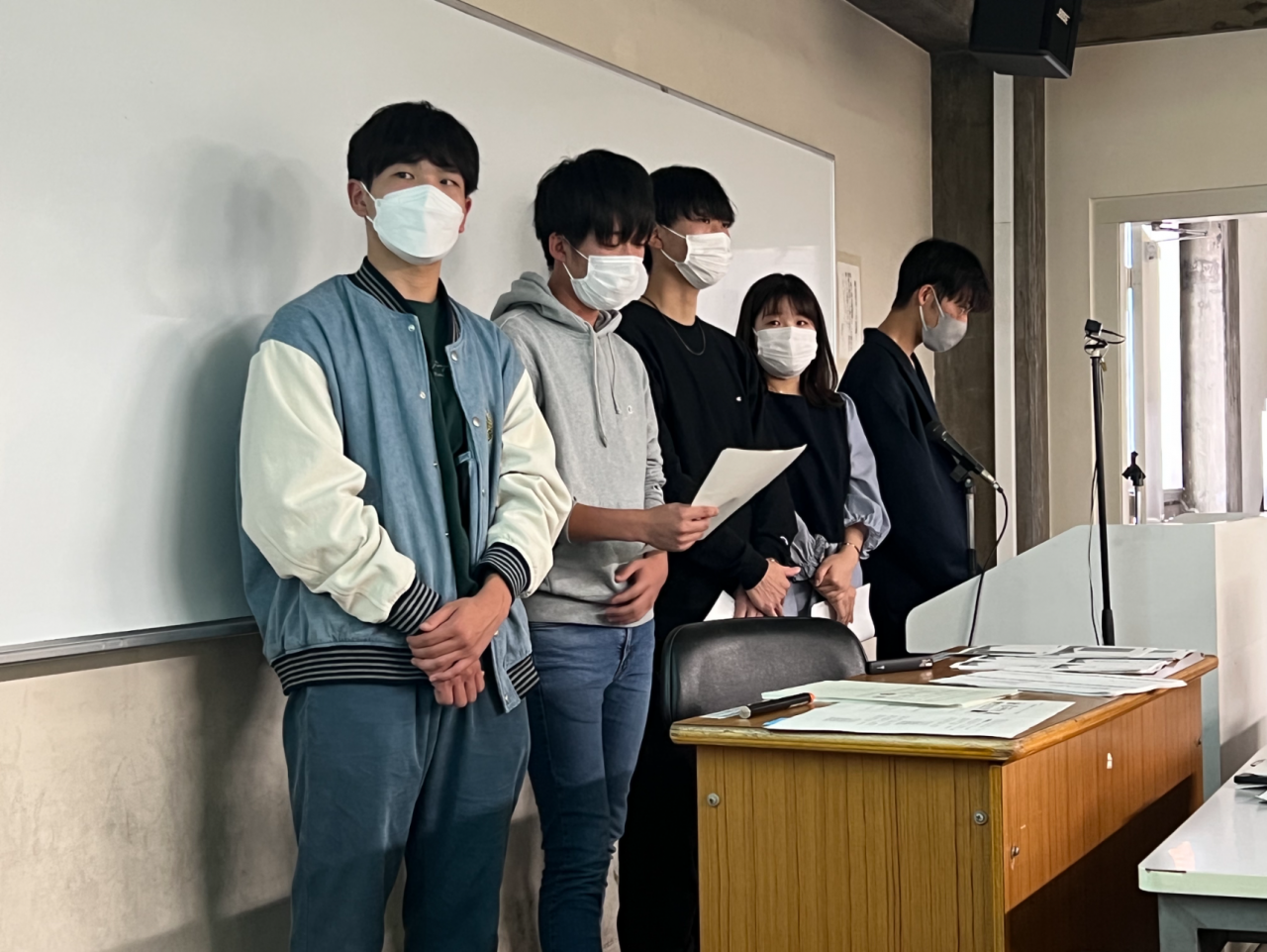 教室では常時換気を行い、マスクを着用するなど、新型コロナの感染拡大防止に努めました。恒例の懇親会は中止です。その代わり、発表の合間に懇親タイムを設けて、教室の内外に分かれて、班ごとに互いの大学を紹介するなど、交流を果たしました。