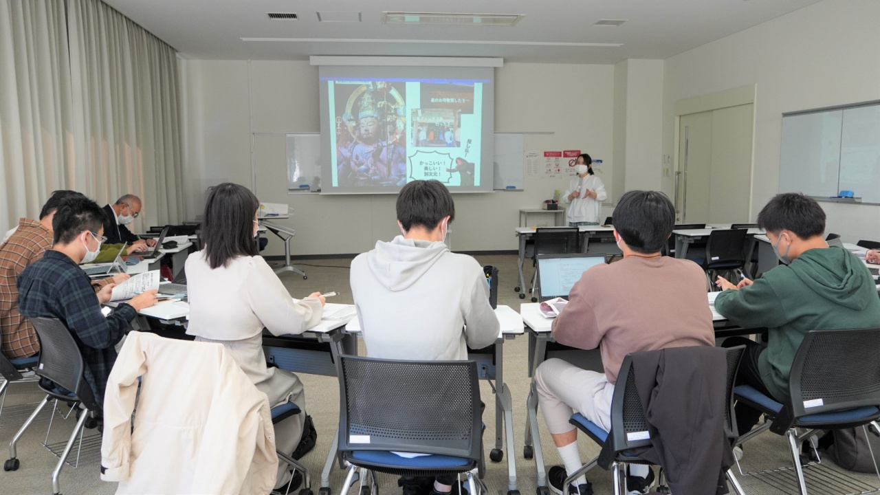社会学部の『社会共生実習(大学は社会共生に何ができるのか―文化財から“マネー”を創出する―)』(担当教員:社会学科 教授 髙田満彦)では、10/28(金)、本プロジェクトの1年目受講生を対象に、観音ガールこと對馬佳菜子氏(合同会社nagoriの代表社員/仏像・地域文化プロデューサー/観音の里コーディネーター/成安造形大学付属近江学研究所・客員研究員)に「観音ガールが行く―滋賀の歴史に恋をして―」と題してご講話いただきました。
