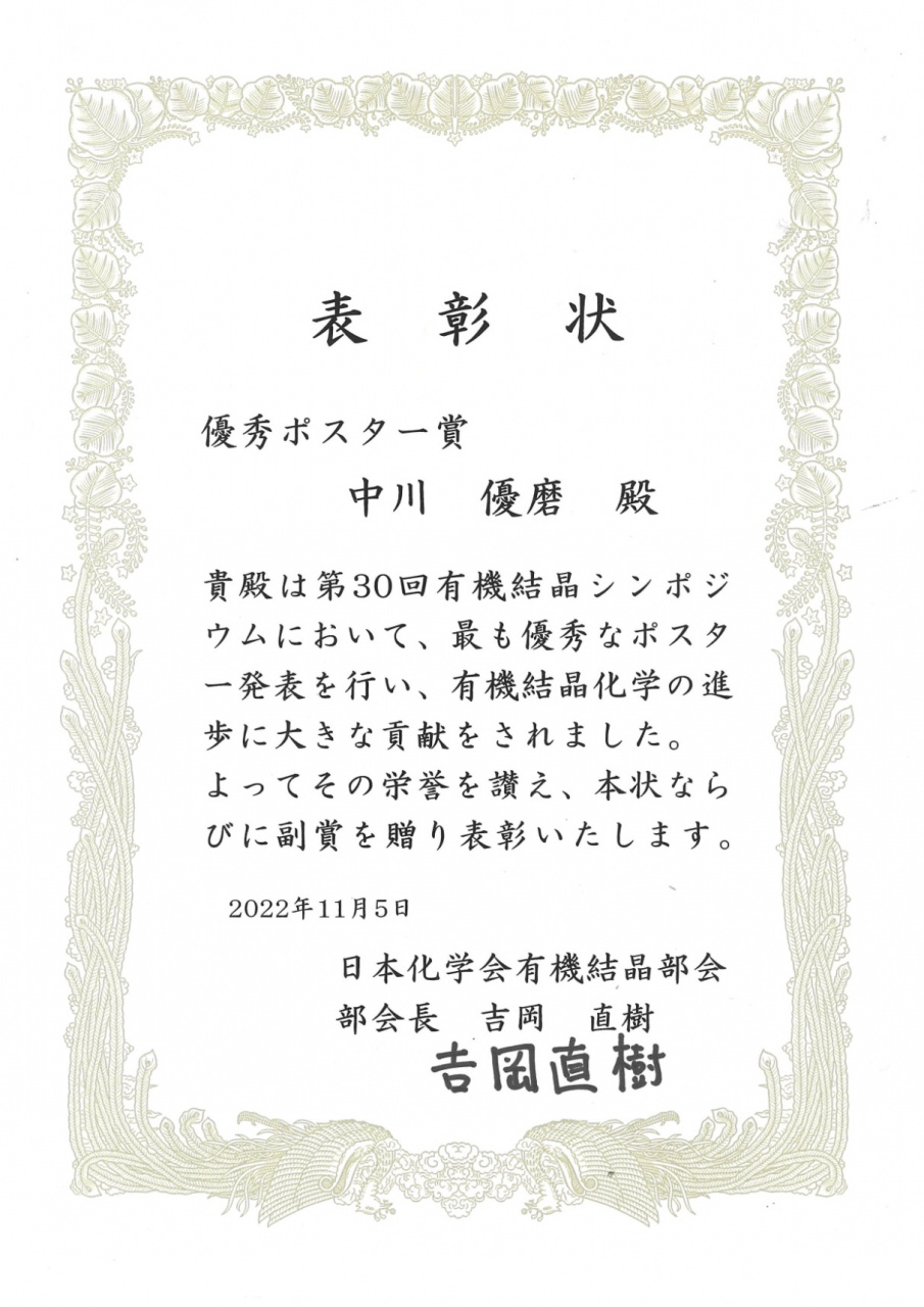 有機結晶シンポジウムで優秀ポスター賞を受賞