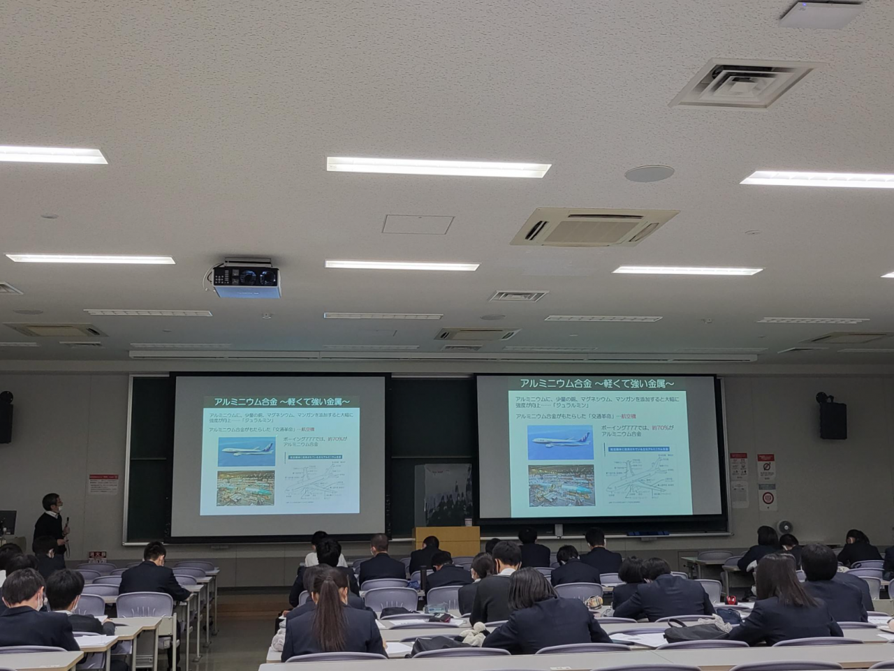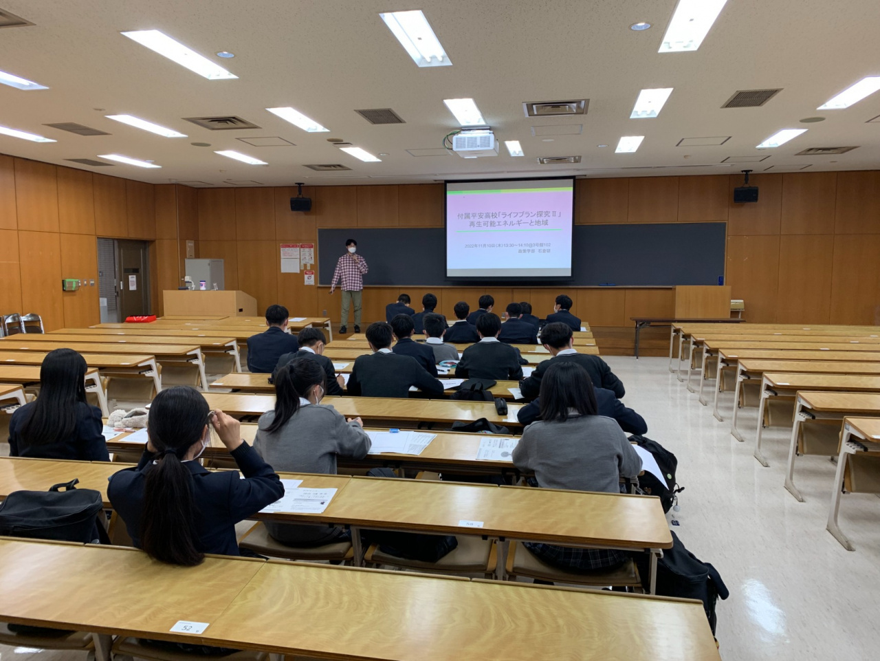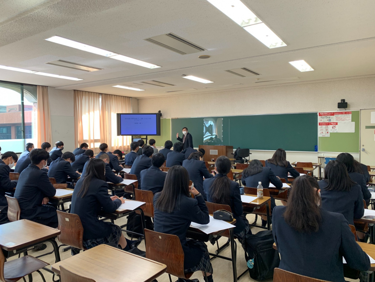 「ライフプラン探究Ⅱ」は、付属平安高校のプログレスコース2年生約300人が受講対象。現代社会が抱える課題や諸問題をグループでテーマ設定し、調査・分析をした上で最後にプレゼンテーションで解決策を発表する探究型の授業として実施するものです。今年度は龍谷大学の10学部と短期大学部2学科から課題テーマを提示し、そのテーマを考える上で必要となるポイントを大学教員がそれぞれの学問分野で授業を行いました。