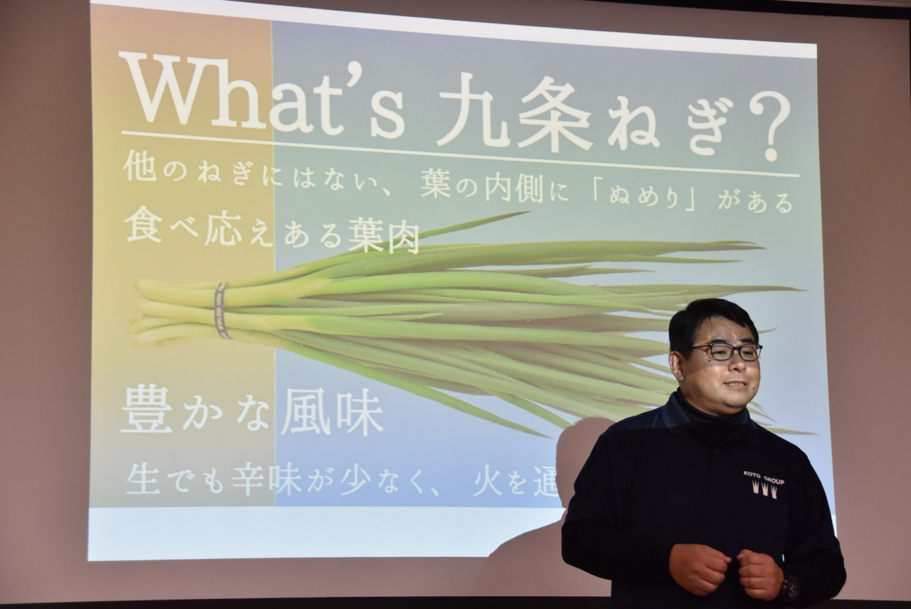 特別講義「我が社の経営と京都」の第2回には、こと京都株式会社 番頭執行役員 宮川光太郎 氏をお招きして、ご講演いただきました。宮川氏は、「九条ねぎ」に特化して事業を発展させてきた同社について詳しく語ってくださいました。
