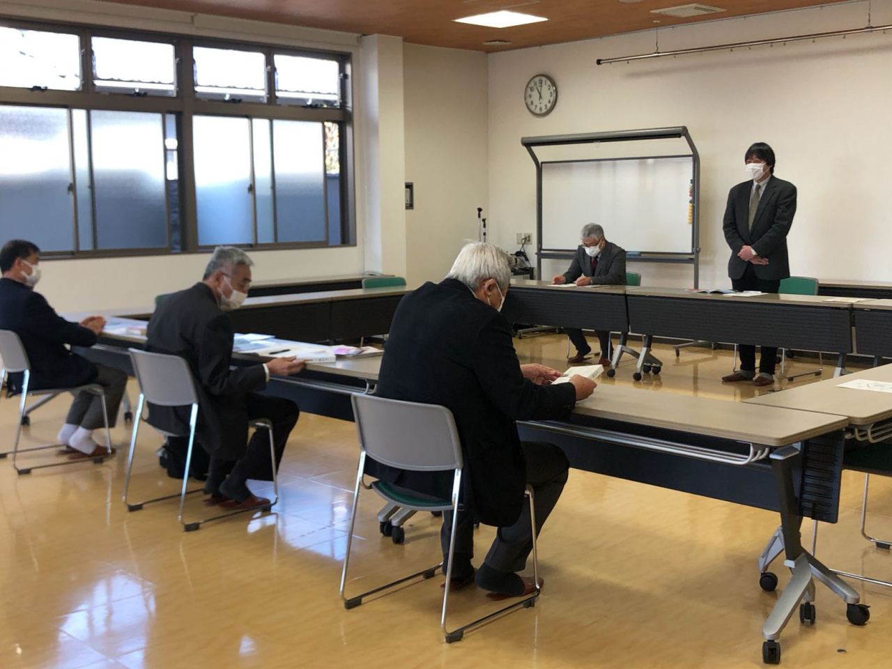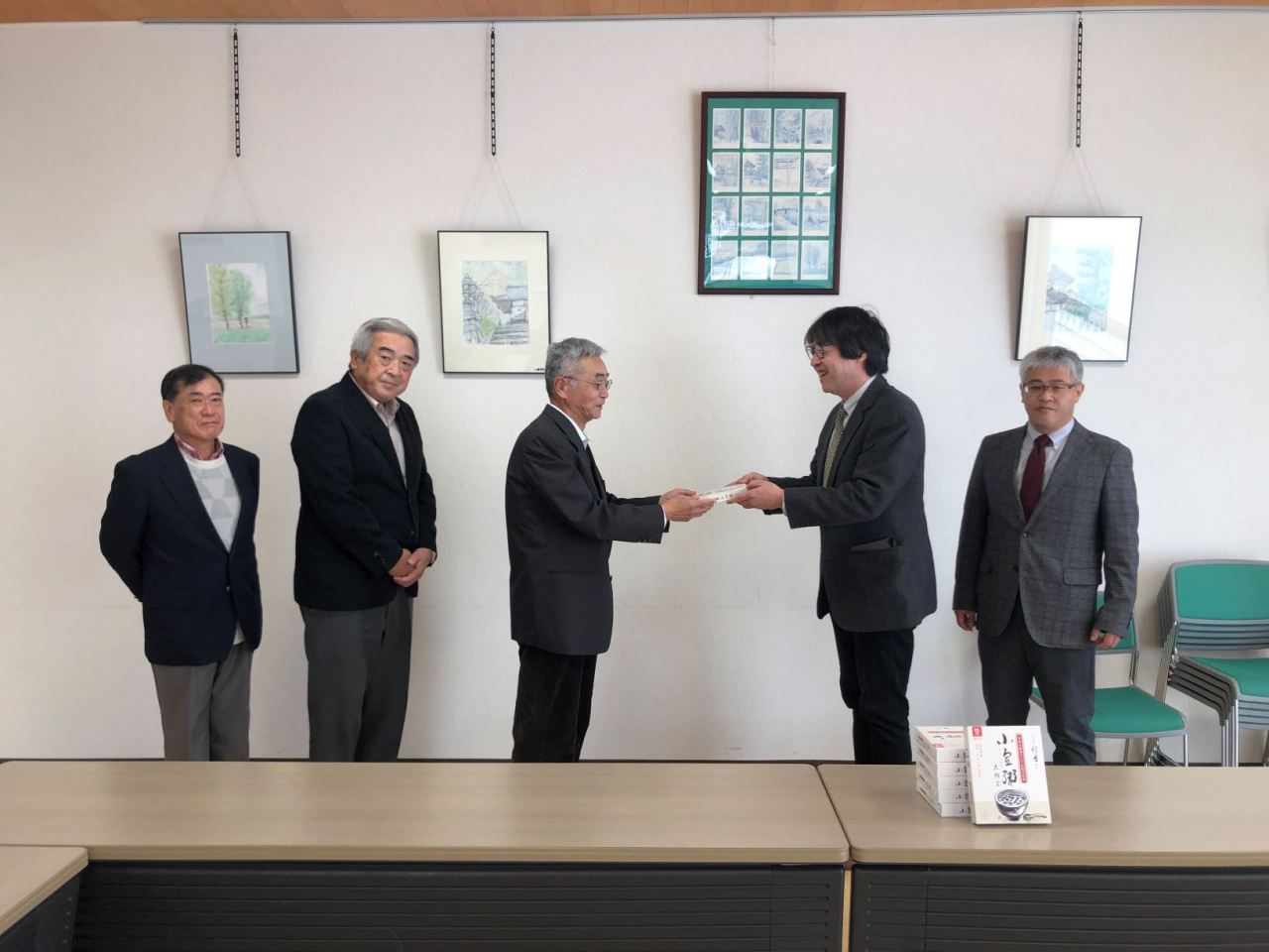 贈呈式では、大門農学部長から、地域に貢献できる研究・教育を目指す取り組み「持続可能な食循環プロジェクト」の第三弾として開発された小豆粥の概要について説明され、上田上学区牧町自治会長に世帯数分の小豆粥が渡されました。