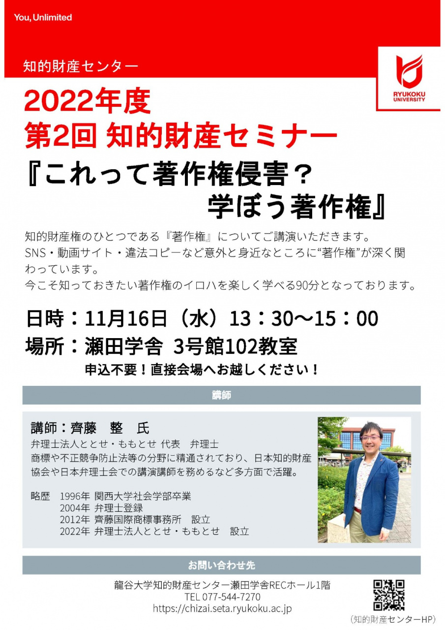 龍谷大学知的財産センターでは、学内における知的財産活動の啓発に努めており、その一環として、学生・教職員を対象とした知的財産セミナーを開催しています。