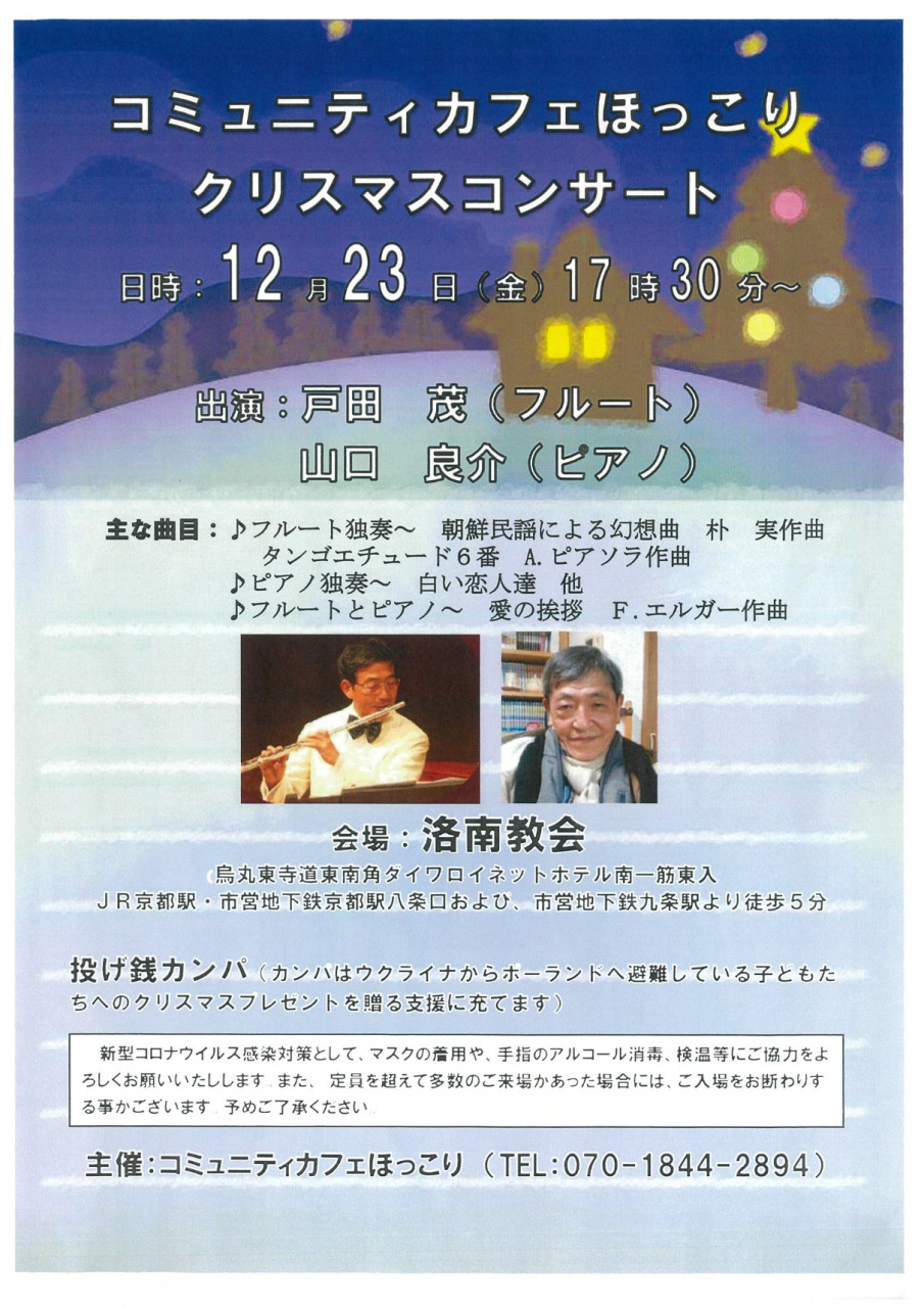 ※コミュニティカフェ「ほっこり」が主催するクリスマスコンサートが12月23日(金)17:30に洛南教会(京都市南区東九条北烏丸町20番地)にて開催されます。