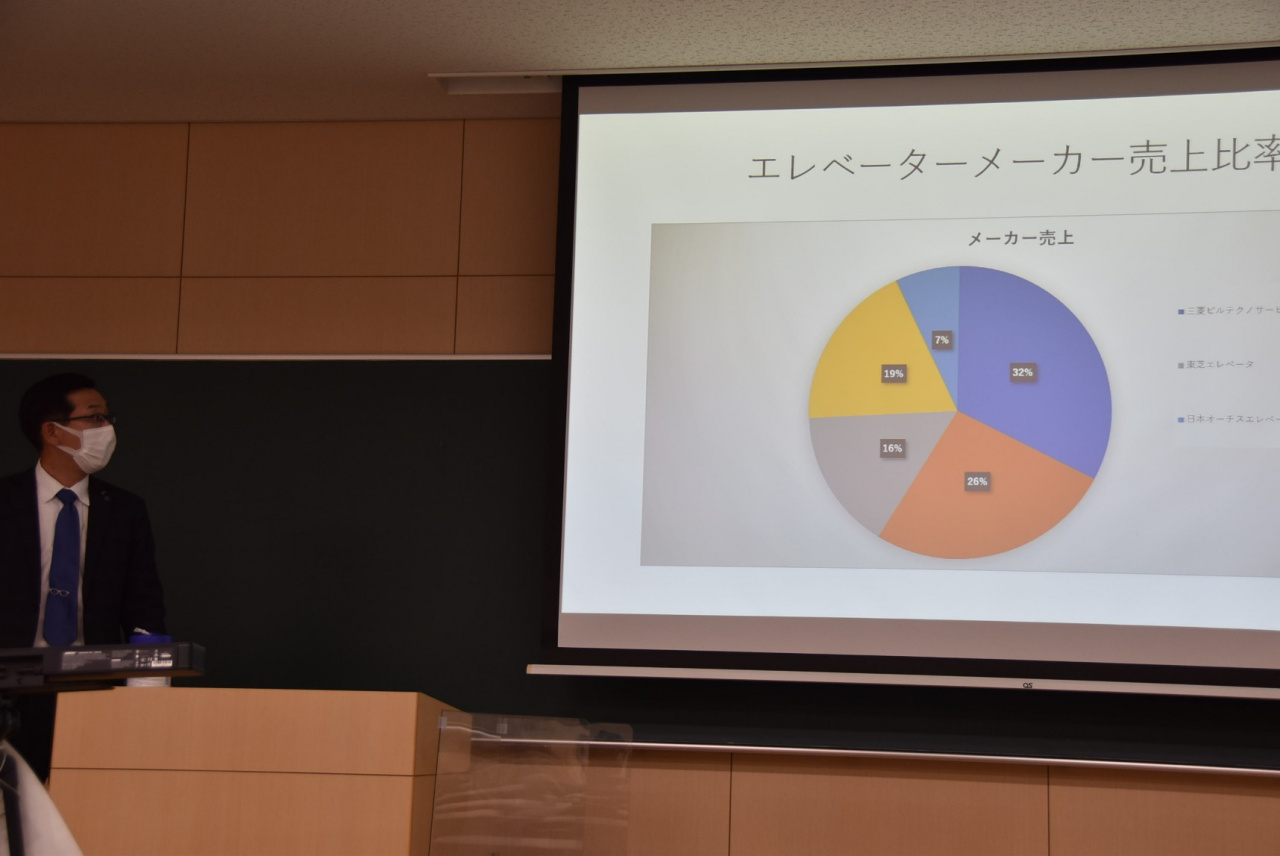 特別講義「我が社の経営と京都」の第3回には、京都エレベータ株式会社 代表取締役 田中陽一 氏をお招きして、ご講演いただきました。田中氏は、エレベーター業界の構造を踏まえて同社の事業展開について語ってくださいました。