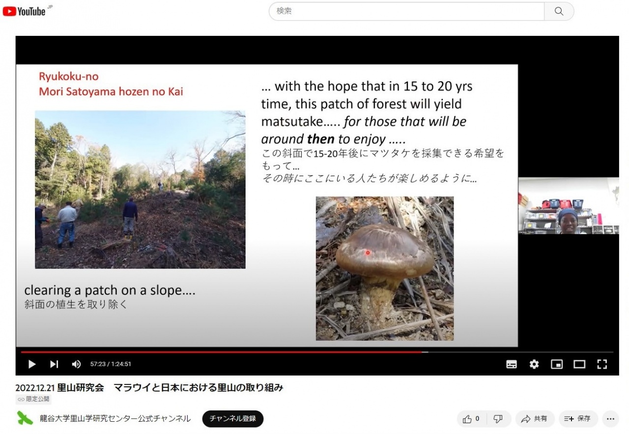 第2報告のチクニ氏は、日本の中で特徴的な里山活動をしている、個人やグループないし団体として、「マツタケ十字軍(マツタケ復活させ隊)」、「みたき園」、「森のようちえん まるたんぼ」、「ヒップホップのラッパーから自伐型林家への転身:大谷さん」、「河辺いきものの森」、「薪遊庭」、「愛のまちエコ倶楽部 里守隊」、「「龍谷の森」里山保全の会」を取り上げ、日本の里山の現状を報告しました。説明された主な内容は、以下の通りです。すなわち、「マツタケ十字軍」では、マツタケの育成の生態学的知見を活かし、歴史を甦らせることなどを、「みたき園」では、伝統と農村文化を守りつつ、地元の資源を活用と地元住民の労働力を活かすことを、「森のようちえん まるたんぼ」では、人間の自然な探究心を利用して3歳から5歳児が自然に触れながら教育を受けられること(子どもの自立心、自発性などの向上)、「ヒップホップラッパーから自伐型林家への転身:大谷さん」では、林業家として若者のロールモデルになっていること、「河辺いきものの森」では、(市民に対する)環境教育やエコツーリズムに関連した活動を行い、森の資源を活用した様々な体験ができることを、「薪遊庭」では、薪や薪ストーブの販売をする中でコミュニケーションに課題を抱えた若者のインターンシップを受け入れ、社会復帰活動に関わっていることを、「愛のまちエコ倶楽部 里守隊」では、地域の森の手入れを通して里山保全に力を入れていることを、「「龍谷の森」里山保全の会」では、健康・運動・仲間作りなど様々な目的を持った人々が週末に集まり、環境保全活動を行っていることをそれぞれ示されました。そして、結論として、まず、日本とマラウイの共通点として、人間の幸福のための自然価値があること、自然資源の管理に多様な立場の人々が参画していること、相違点として、世代間の利益(未来への構築)を挙げました。次に、森林が過剰利用や過少利用されている地域に対する自然の利用と保全とのバランスを取るための提案として、長期間のモニタリングを実施し、その結果を資源利用者に伝えること、自然の価値を地域及び世界的な標準に合わせて再評価し、地域の人々に普及させることなどを述べられました。その上で、技術的発展の結果、日本の人々の生活は森林資源に依存していないこと、森林資源が十分に活用されていない原因に地形や輸入品の安さがあること、自然の利用と保全とのバランスを取るために、自然との新しい付き合い方を考えることなどを説かれました。