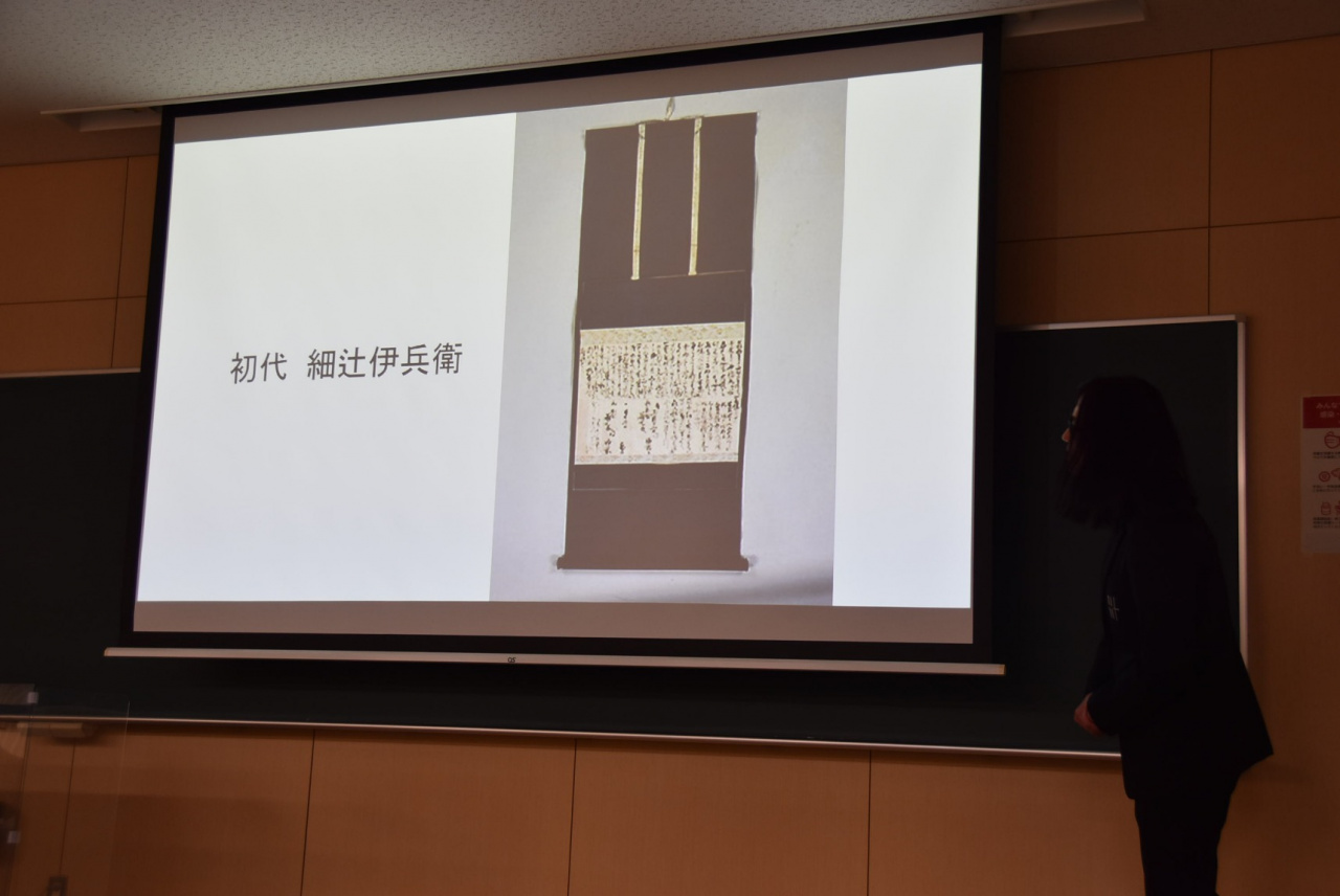 細辻氏は、いくどもの危機を乗り越え、2015年に「奇跡の400年」を迎えた同社の歴史について語ってくださりました。そのうえで、ご自身が手がけてきた作品の実物を教室で見せてくださるとともに、多くの写真でも紹介されました。コロナ禍でも、八世細辻伊兵衛 に倣って京都を盛り上げようとして、「令和京都博覧会」を開催されていることを述べられました。