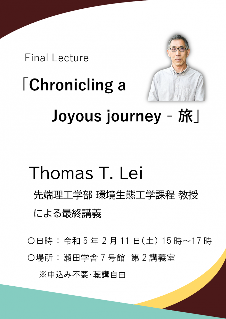 2023年3月末で退職される Thomas T. Lei 環境生態工学課程教授の最終講義を以下のとおりおこないます.