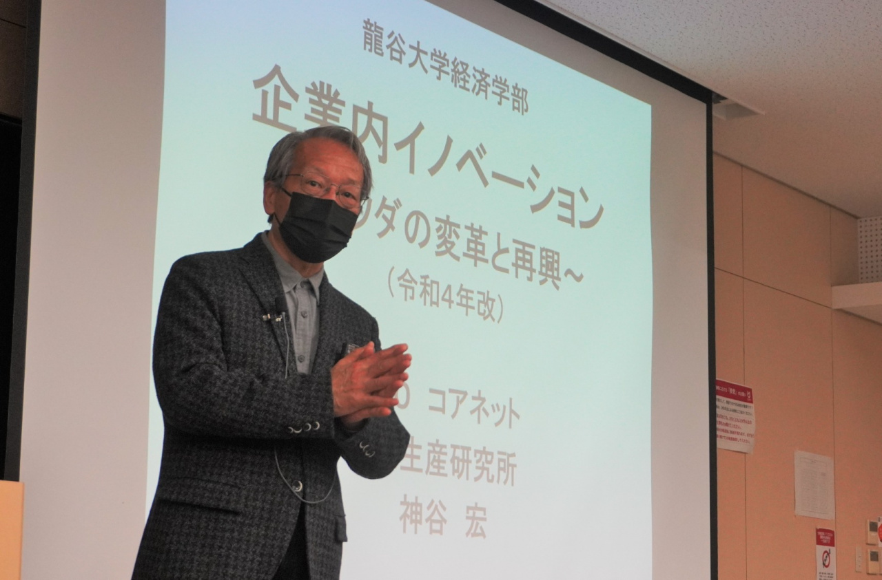 第1回目となる11月26日の日本経済論(担当:伊達浩憲教授)の講義では、元マツダ株式会社執行役員・本社工場長の神谷 宏氏をゲストにお招きして、「企業内イノベーション―マツダの変革と再興」をテーマに、1990年代のバブル崩壊以降の同社の開発・製造戦略の転換について丁寧に講義していただきました。
