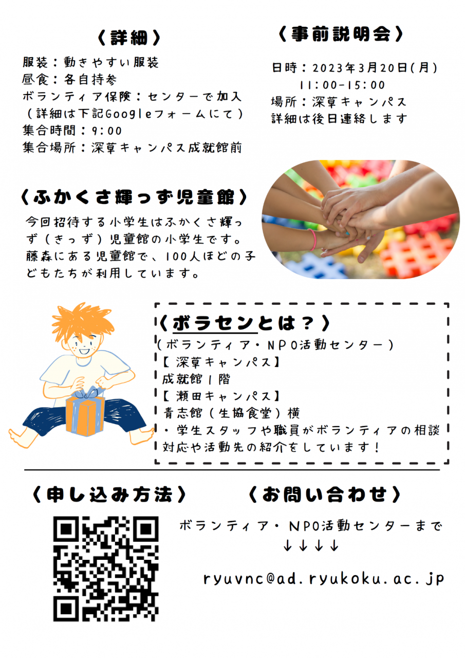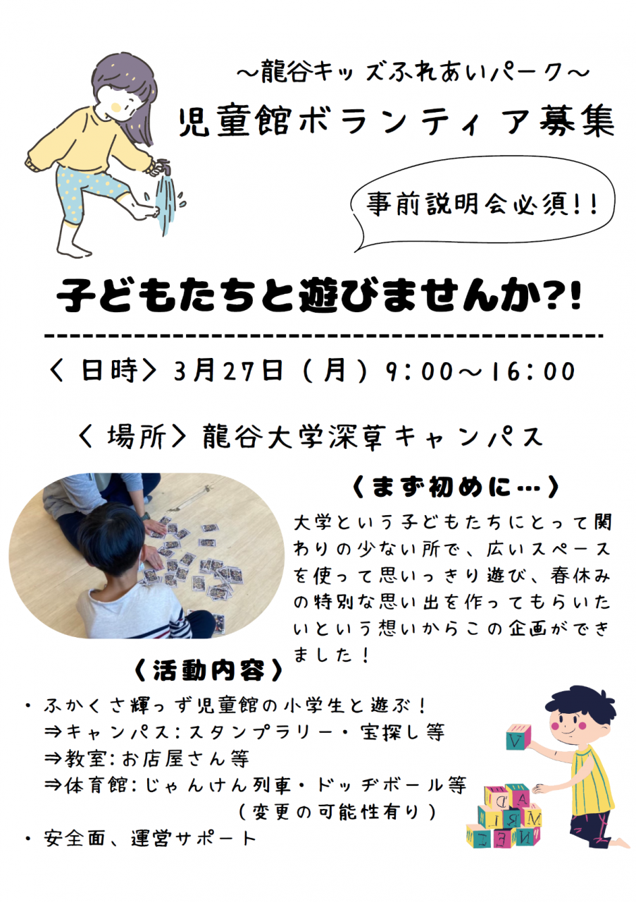 深草学生スタッフ企画である、「龍谷きっずふれあいパーク~あなたも子ども達と遊びませんか?~」を一緒に盛り上げてくれるボランティアを大募集します。