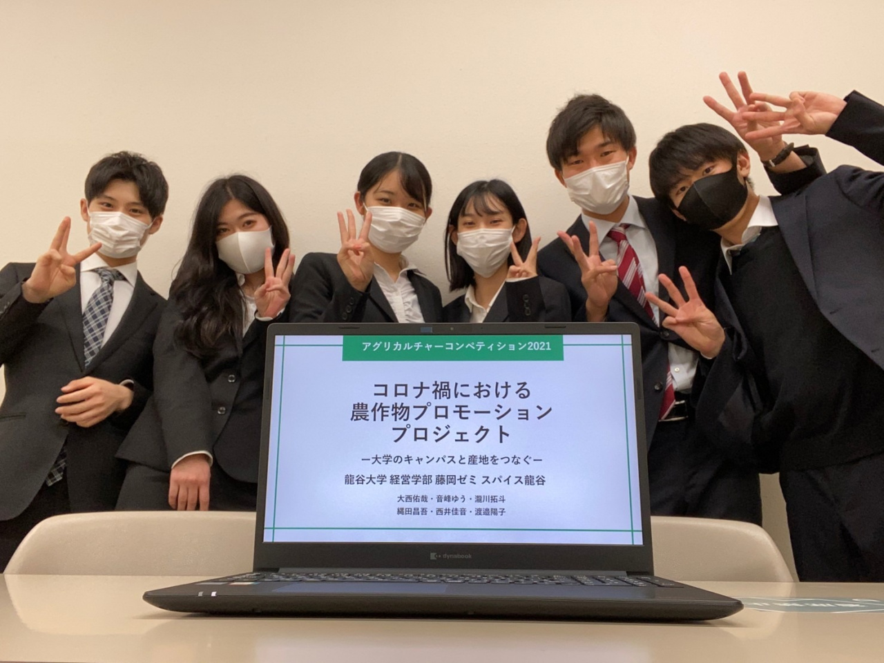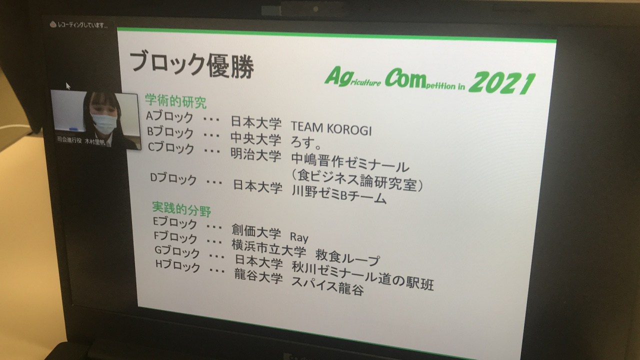 また、藤岡ゼミでは毎年11月頃に開催されるアグリカルチャーコンペティション※にチャレンジしています。(※近年、低い食料自給率や地域の過疎化・高齢化などの問題が指摘されており、将来的にこうした問題に直面する若者自身が食・農・地域・協同組合といったテーマに向き合うことを目的としたコンペティション(大会ホームページより抜粋))西井さんはフェアの最中にこの準備にもとりかかり、数日で審査資料を事前に提出しなければなりませんでした。この頃が学生生活で一番大変だったと西井さんは振り返ります。藤岡ゼミから2チームがオンラインで出場し、西井さんの所属するチームがブロック優勝を獲得します。