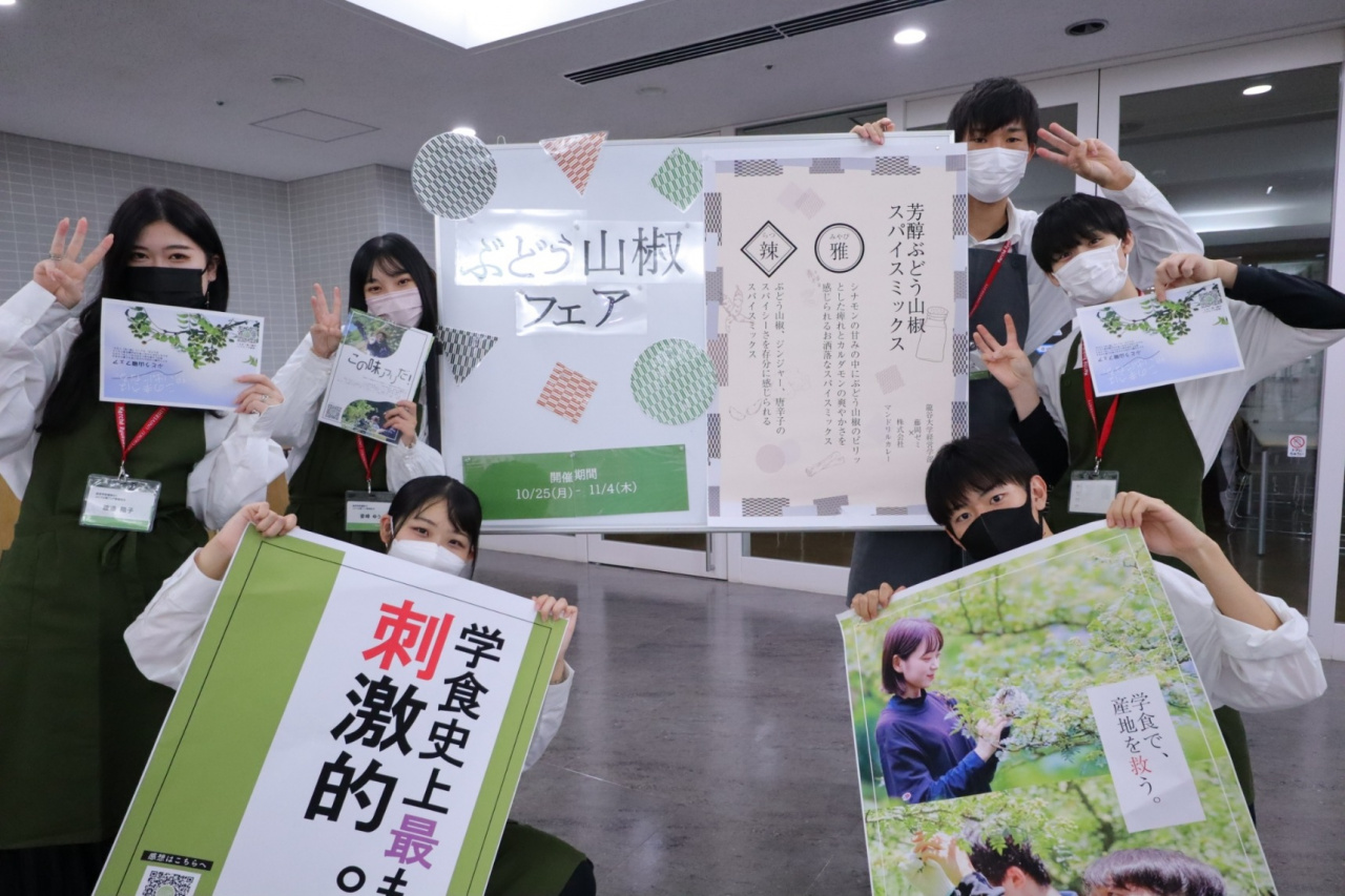 「これだけ規模が大きくなってくると次に出てくるのが不安感でした。プロジェクトリーダーにもなっていたのでぶどう山椒が受け入れられるのか、失敗に終わったらどうしようとマーケティングの怖さを感じました。生協さんの協力を無駄にしない為にも広報に力を入れ、動画やパンフレット、チラシ作成を懸命に行いました。」学生の皆さんもこのフェアを見たり食べたりした方が多いのではないでしょうか。結果としてメンバーが想定していた4,500食を大きく上回り2週間で約1万1,000食を販売し、結果として成功させます。