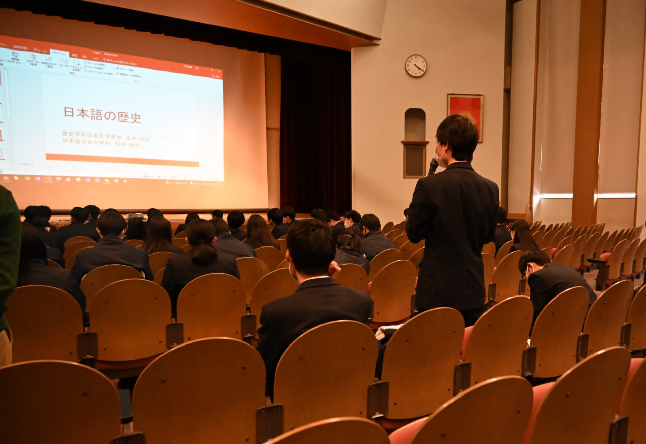 付属平安高等学校高大連携プログラム(入学前プログラム)のプレゼン大会を付属平安高等学校講堂で開催【文学部】