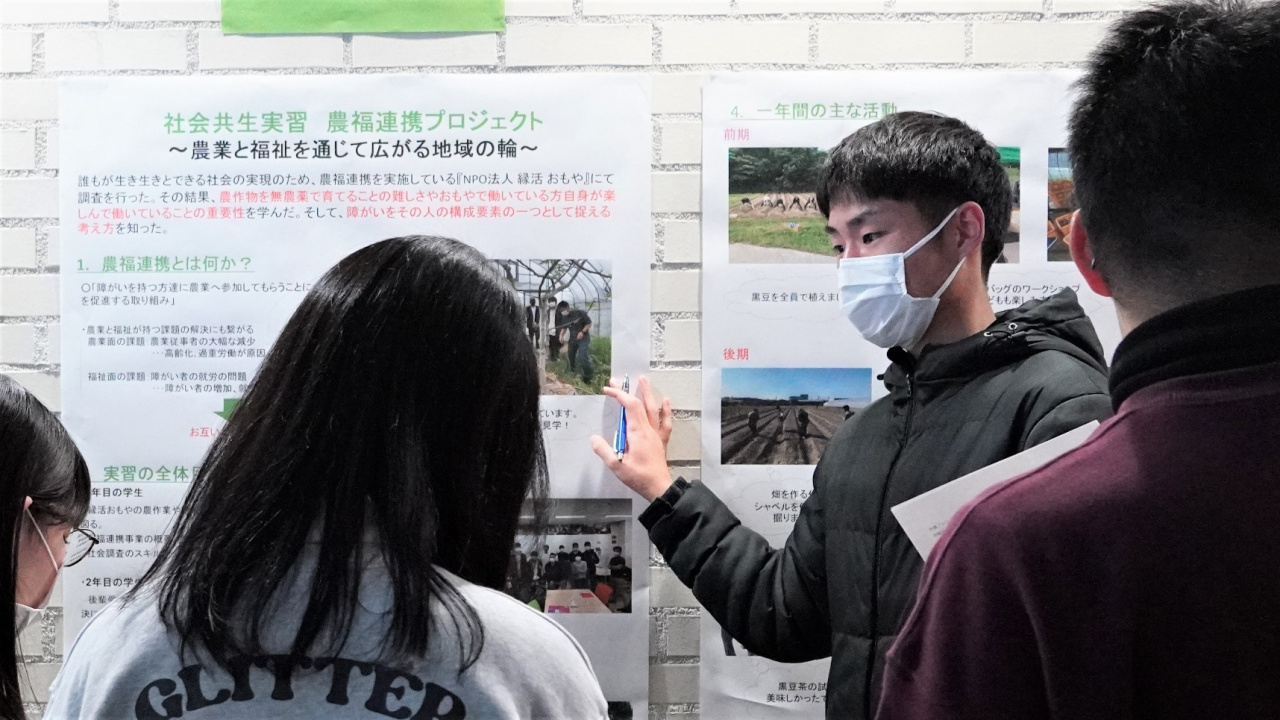受講1年目の学生は、連携先である“おもや”(特定非営利活動法人縁活)の農作業や地域イベントに参画し、受入れ先の状況把握や関係者との信頼構築を図った。また、農福連携事業の概要、課題把握と解決に向けた提言策定を図るとともに、社会調査のスキルアップにも挑戦した。