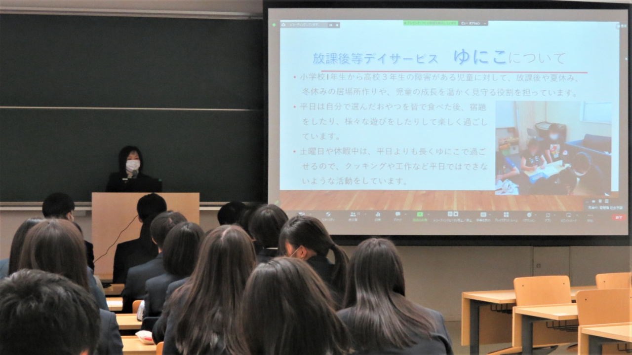 また、“ゆにこ”利用児童の保護者の方からも講話をいただき、お子さんの障がいがわかったときの心情や、支援を受けることについての想い、周りの方との関わり、お子さんに対しての想いを教えていただいた。普段、子どもたちと関わるだけではわからない保護者の方の想い、子どもを育てることの大変さ、障がいを持つ子どもを育てているからこそわかる「生きていることの素晴らしさ」を学ぶことが出来る、大変よい機会であった。