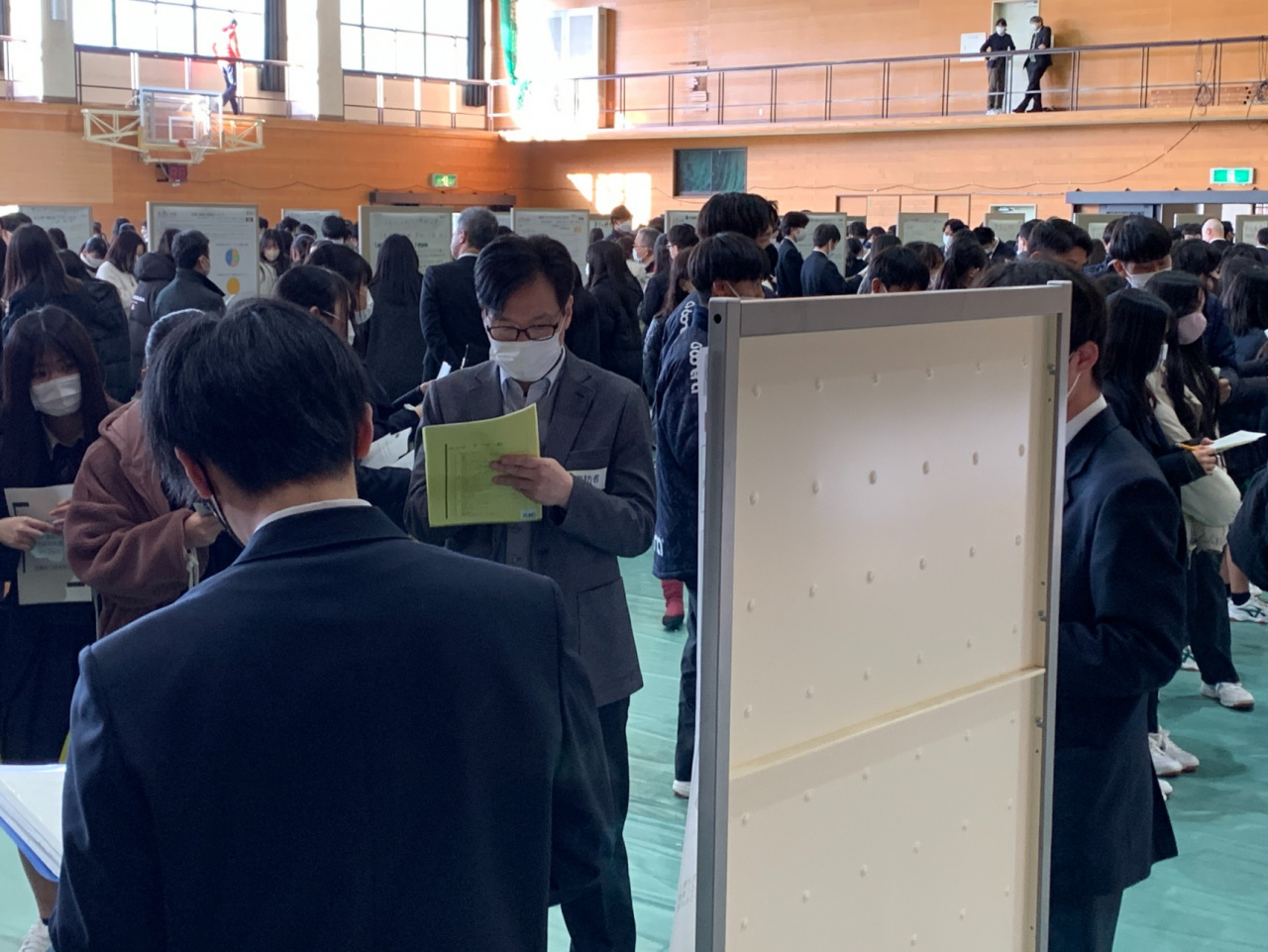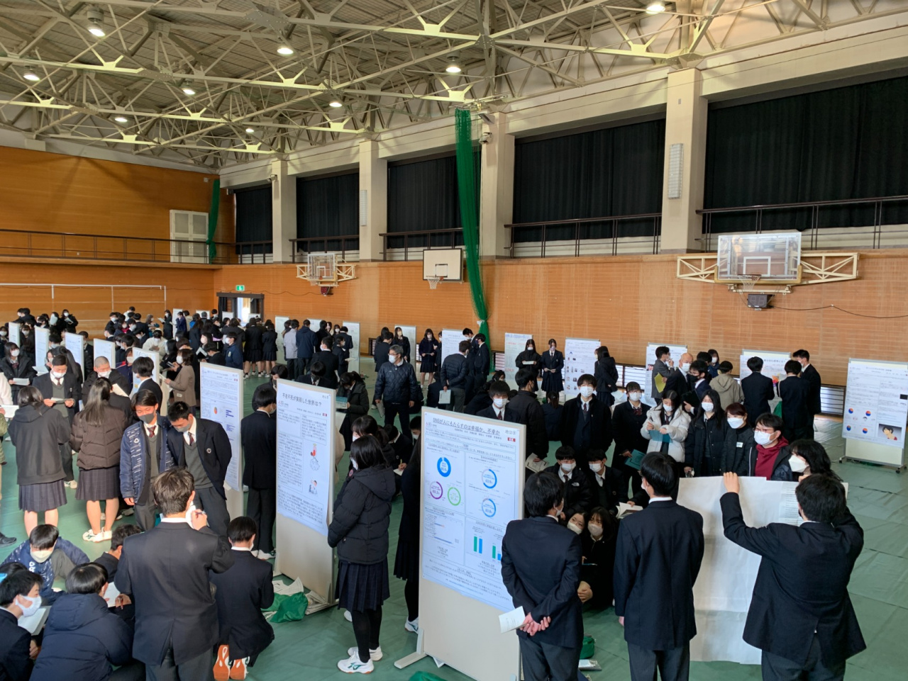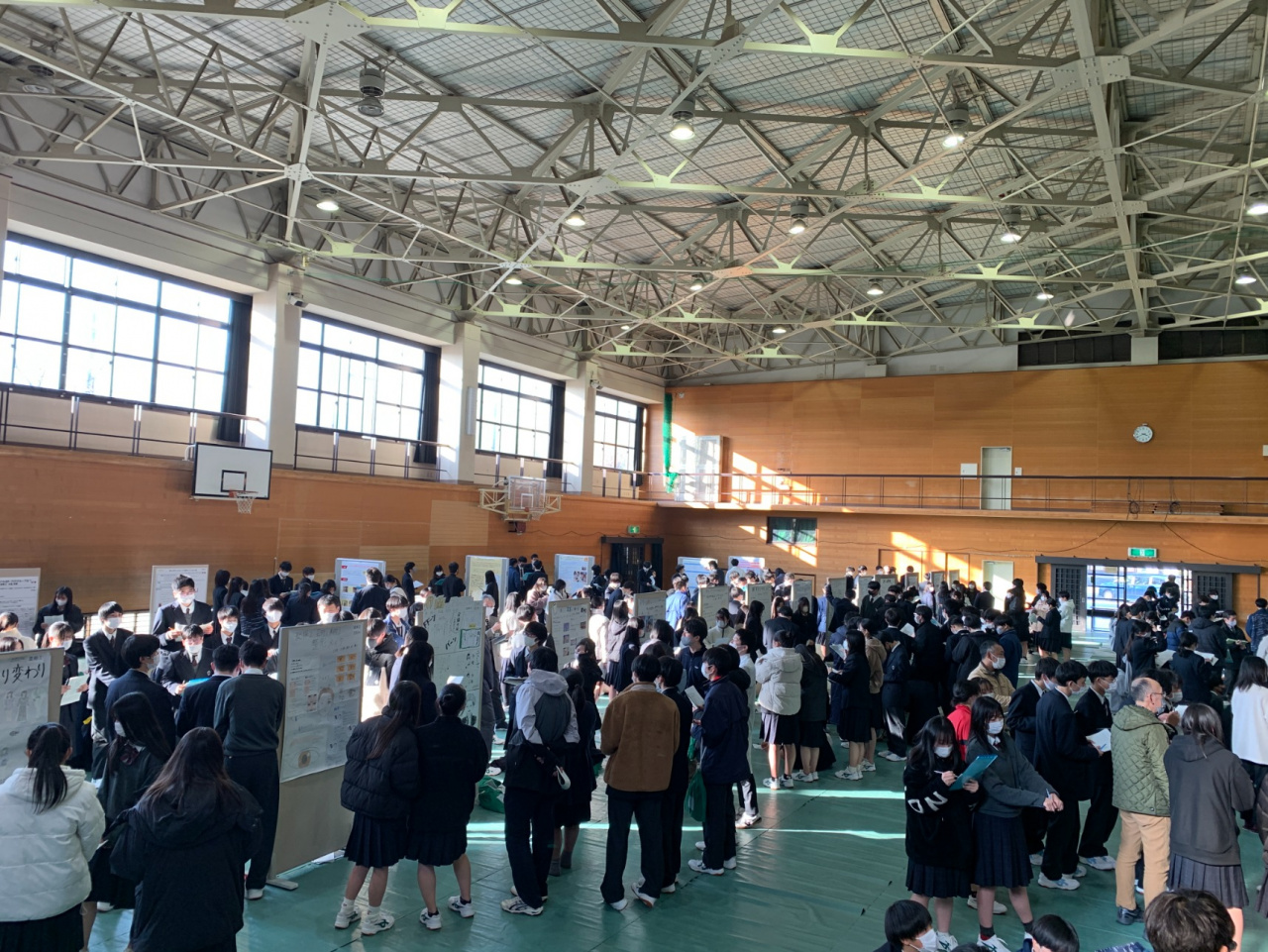 本プログラムに参加する同校2年生は10月に中間発表会を行っており、今回の最終研究発表会が活動の集大成となります。最終研究発表会はポスターセッション形式で行われ、会場となった体育館には83もの探究テーマが並べられ、参加した生徒約350名がそれぞれのポスターを前に、探究内容の紹介や質疑に応えるなど真剣に取り組んでいました。