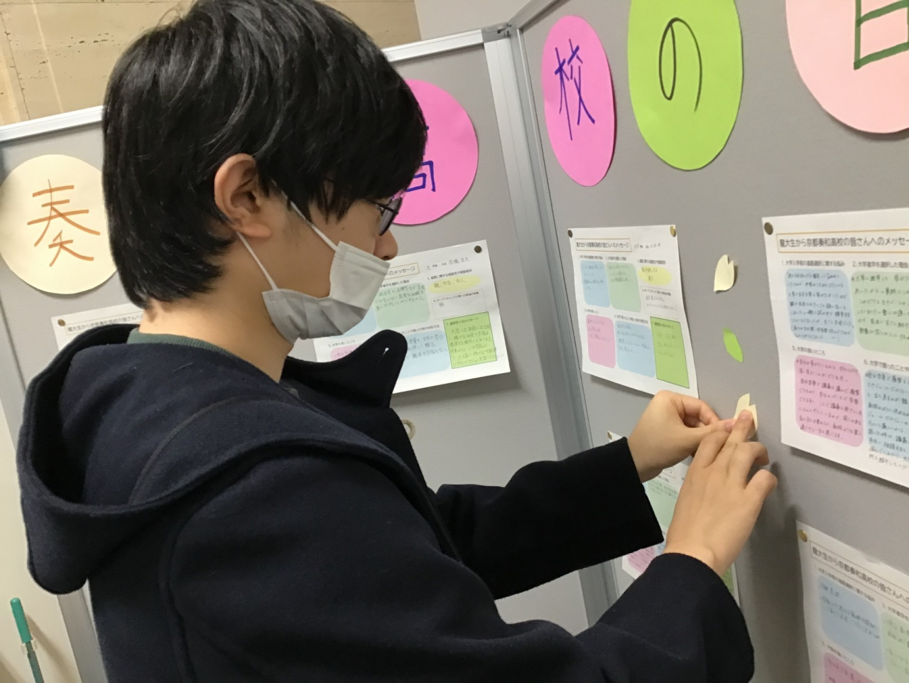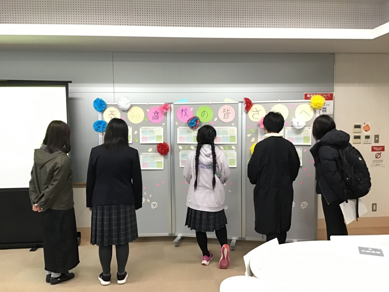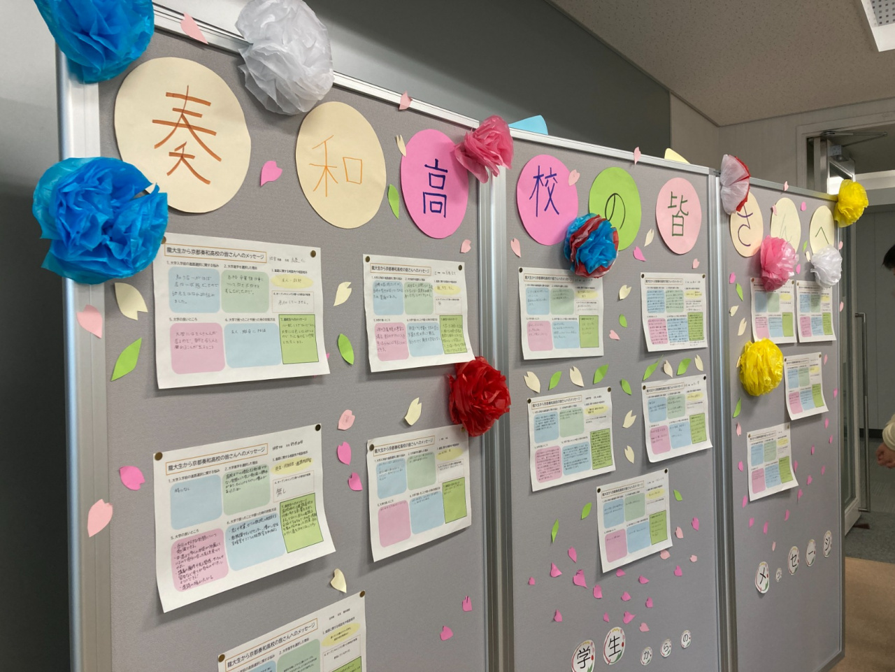 交流会の前半では高大連携推進室による龍谷大学の紹介およびキャンパスツアーを行った後、後半では京都奏和高校の生徒および保護者をお迎えするにあたり会場を移動して、共生のキャンパスづくり実行委員の学生が事前に手づくりしたメッセージボードをお披露目するなど、温かい雰囲気で始まりました。