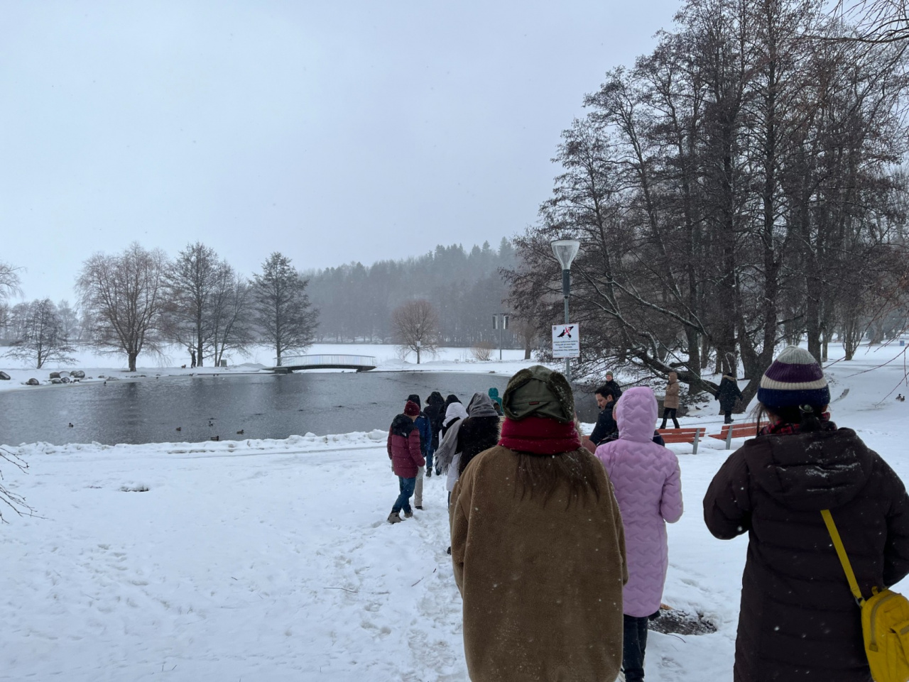 今日は朝から雪が降っていたので、みんな防寒対策をしっかりしていました。学校での講義は雨水管理や水質保護、景観政策について学びました。講義を受けるのも3日目となり、少しずつ英語での授業に慣れてきたため積極的に取り組めるようになってきました。フィールドワークでは2つの公園へ行き貯水池を実際に見てラハティの環境政策を実感することができました。雪の中でしたが留学生とも楽しみながら学ぶことができ良い体験になりました。学校も折り返しなので、よりコミュニケーションを取りながら学びを深めていきたいです。