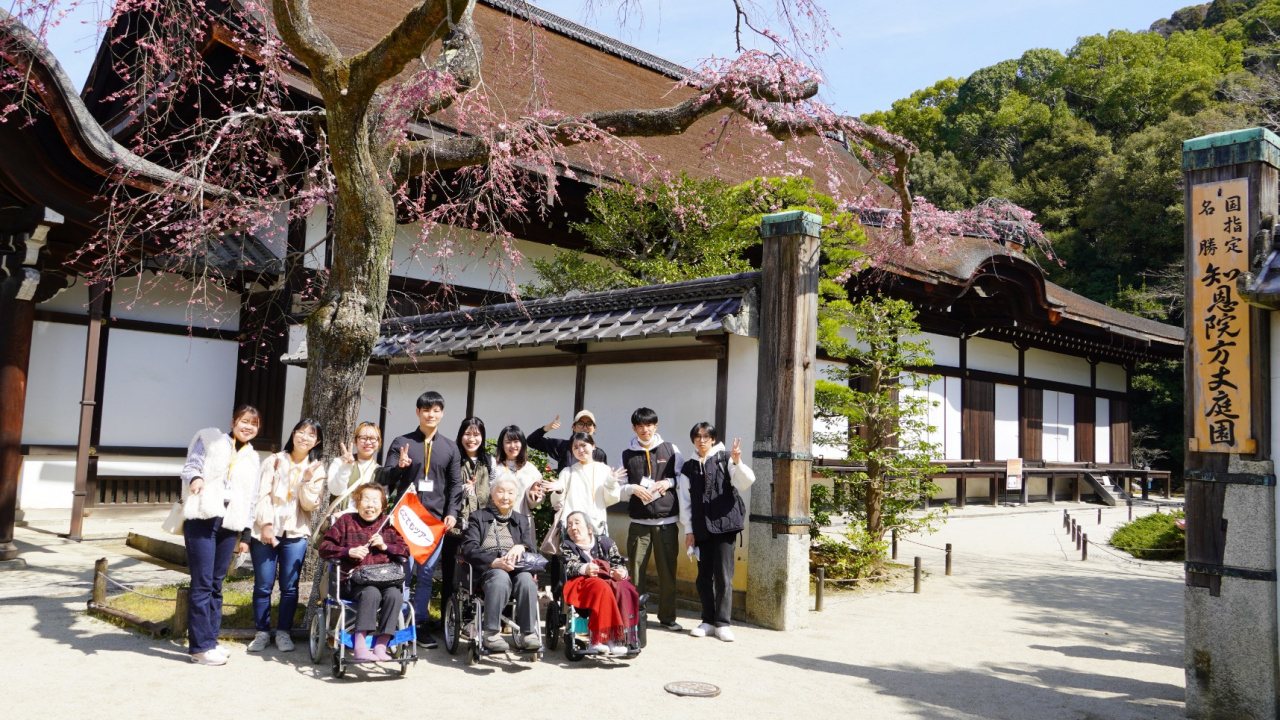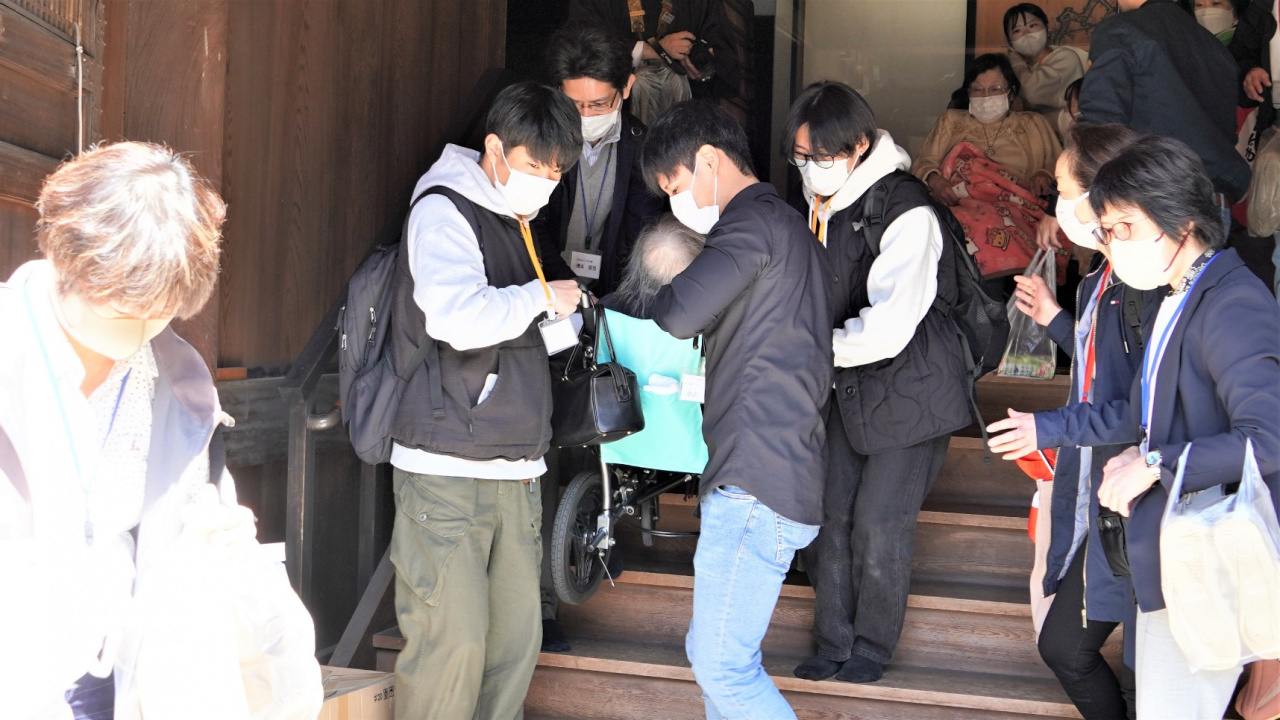 その後、特別拝観『第57回「京の冬の旅」大方丈・小方丈・方丈庭園特別公開』へと移動しました。道中には大小のステップがいくつもあり、その度に車椅子をうしろ向きにしたり前方を持ち上げて超えました。また、方丈庭園へ行くには階段を使用するしか術がなく、受講生と本プロジェクトの連携会社(株式会社どこでも介護)スタッフの男性陣が総出で車椅子を担ぎました。