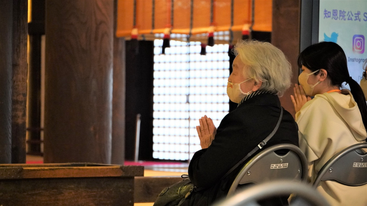 記念撮影ののち、いざ本堂である御影堂へ。健常者であれば、御影堂へは正面の階段を上るとすぐに到着できますが、今回ご参加くださった4名の方のうち3名は車椅子が必須のため、別棟に設置されているエレベーターを利用して、正面を通り越して横に設置されているスロープを利用して入室しました。