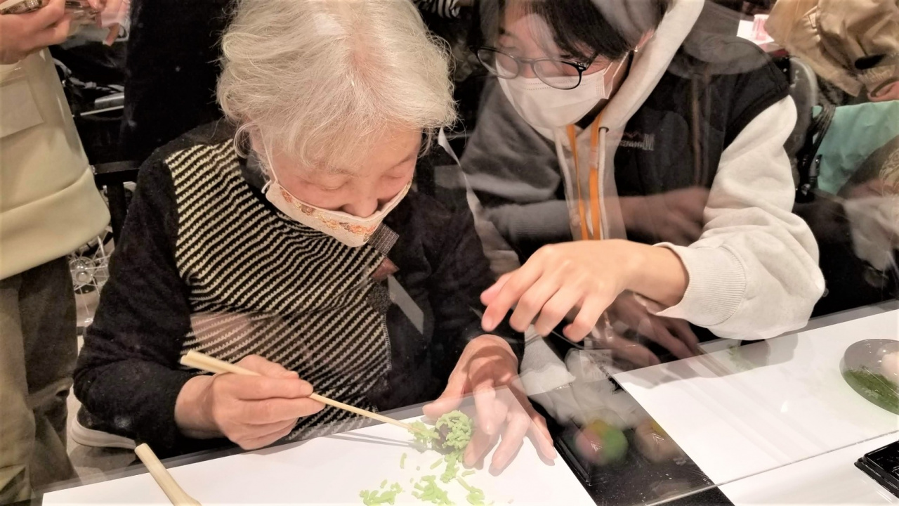 ここでは参加者の皆さんが見本に沿って和菓子を可愛い花形に成形しました。手先の不自由な方には受講生が手を添えて介助させていただき、それぞれ可愛く素敵な和菓子が完成しました。