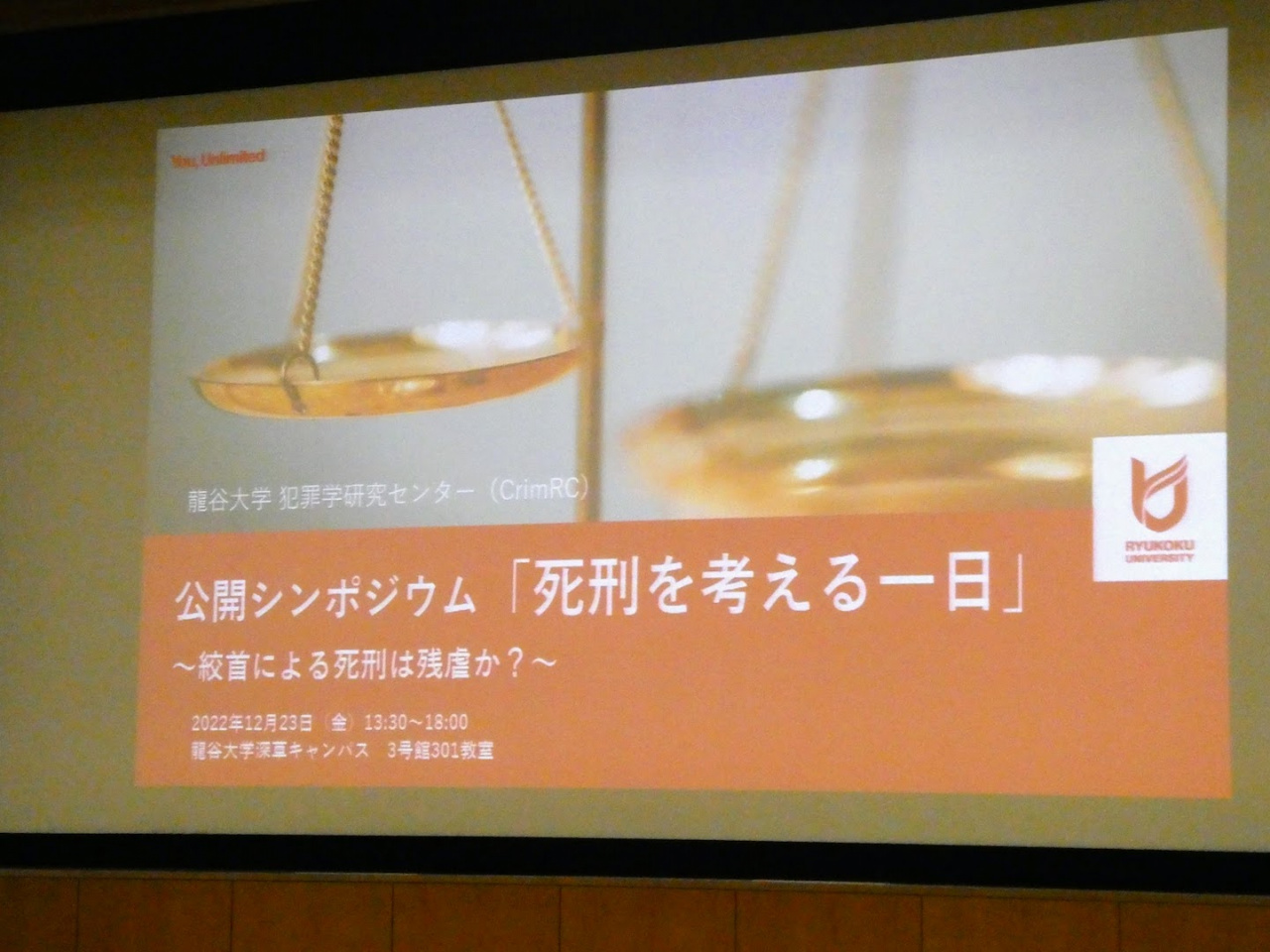 2022年12月23日(金)、龍谷大学 犯罪学研究センターは、公開シンポジウム「死刑を考える一日〜絞首による死刑は残虐か?〜」を開催しました。本シンポジウムは、石塚伸一教授(本学法学部、前犯罪学研究センター長)が、龍谷大学に赴任してから刑事政策の受講者を対象に、年の瀬に行っていた催しです。なぜ、年の瀬のイベントなのか?それは、死刑の執行は、国会閉会後に行われることが多いからです。今回の「死刑を考える一日」は、死刑の存廃を議論する前に、日本の死刑の現状を一人でも多くの人に知ってほしいという思いから始まりました。