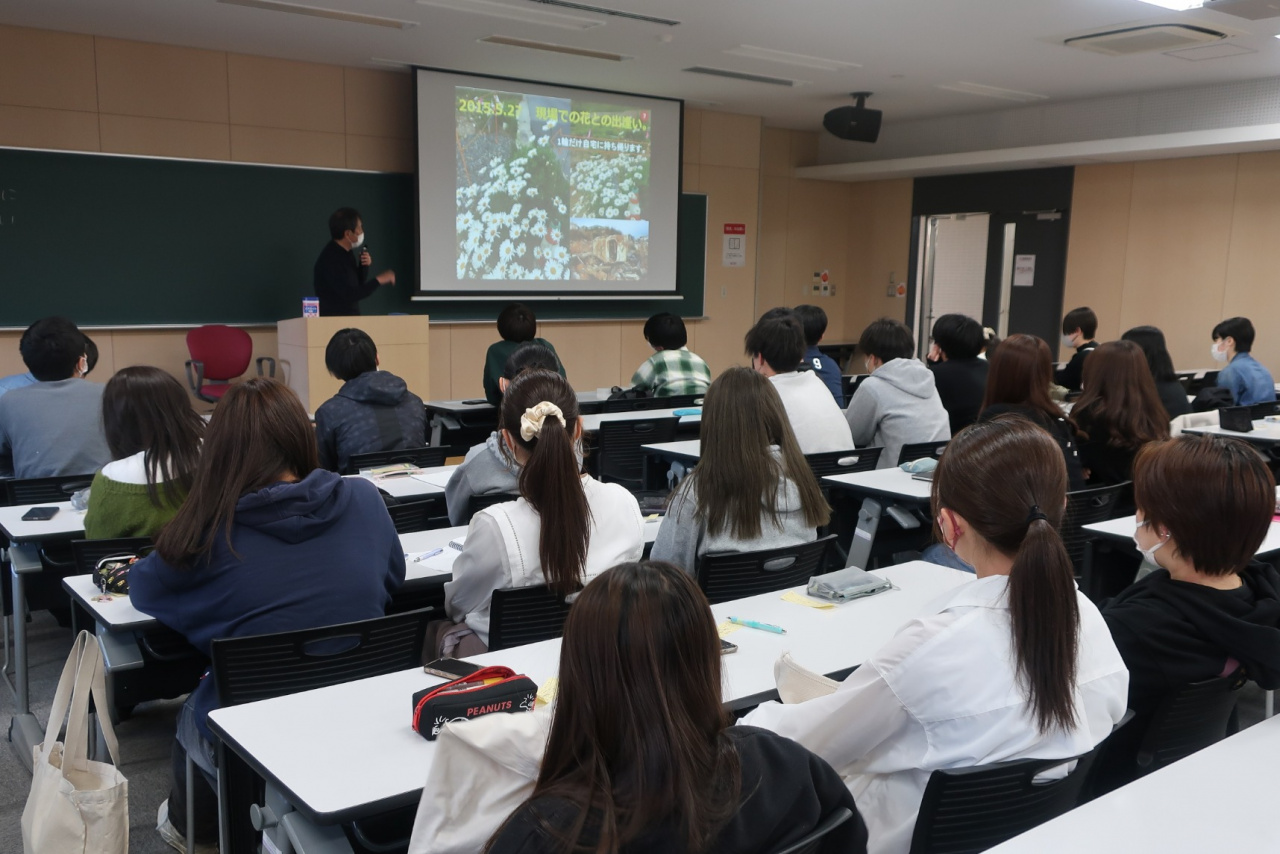 2023年4月22日(土)「いのち」を考えるための実践的教育プログラムの一環で、基礎演習の授業に「アイリンブループロジェクト」のプロジェクトリーダーの菅原淳一さんにお越しいただきました。東日本大震災で津波被害に遭い亡くなった佐藤愛梨ちゃん(当時6歳)が発見された場所に咲いたフランス菊「あいりちゃん」を全国に広めることで、いのちの伝承と防災教育を目指しているのがアイリンブループロジェクトです。愛梨ちゃんは生きていたら、受講した学生と同じ歳。学生たちは、菅原さんの話と、事前に録画しておいた愛梨ちゃんの母親の佐藤美香さんの話を真剣に聴いていました。今年も1年間、学生たちとキャンパスに植えた「あいりちゃん」を育てながら、いのちについて考えていきたいと思います。