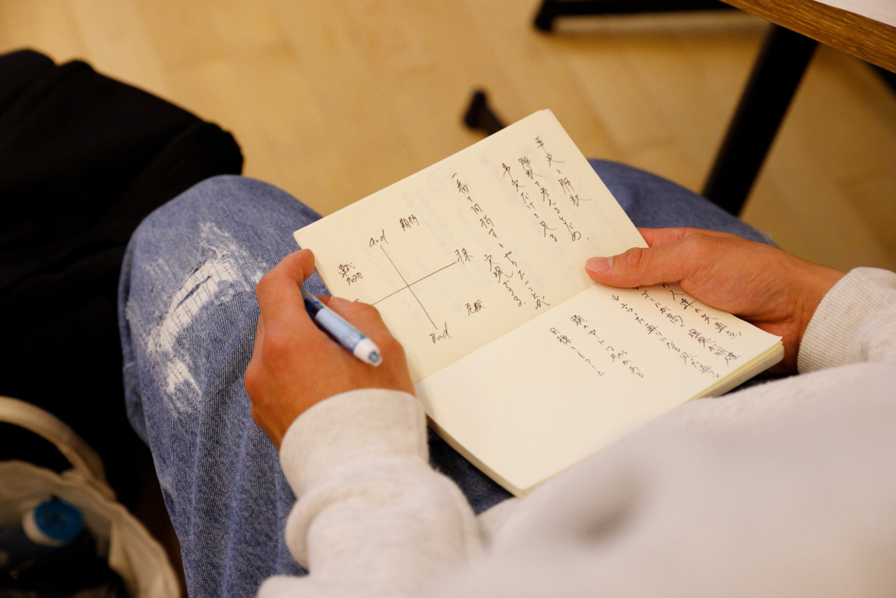 イベントは、株式会社京伝びとの代表取締役である梅原英哉氏とのクロストークの形で行われ、秦氏が普段から大切にしている考え方として「事実と解釈を分けて考えること」や「過去−未来の軸と、成功−失敗の軸のバランスの取り方」などが共有されました。その後に続いた質疑応答では、学生からの「大学生の時にやっておいた方が良いこと?」や「頭ではわかっているがなかなか行動に移せない。何かアドバイスはいただけないか?」といった質問に対して、秦氏からは、「どんなに小さなことでもよいので、とにかく一番を目指すこと」、「重要なのは、決断すること。人生は後戻りもできないし、1つの道しか選べない。後悔せずに、決断した道で幸せになろうと努力すること。」が大切だといったアドバイスをいただきました。