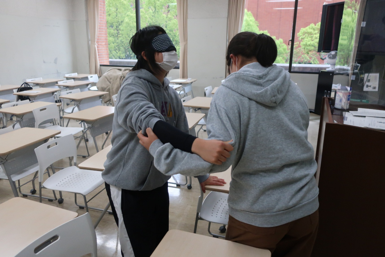 2023.05.19 【社会福祉学科】「視覚障がい者の理解と介護実技」の授業 社会福祉学科必修科目「ソーシャルワーク現場実習指導Ⅰ」の中で「視覚障がい者の理解と介護実技」の授業を実施しました。 手引する側と手引きされる側の両方を体験することで、視覚障がい者や手引きの仕方について学ぶだけでなく、介護される側の気持ちを少しでも理解するとともに、適切な配慮(人的、物的等)があれば障害があることによる不便を減らすことができることを体験的に理解することをねらいとしています。 授業の様子 授業の様子 授業の様子