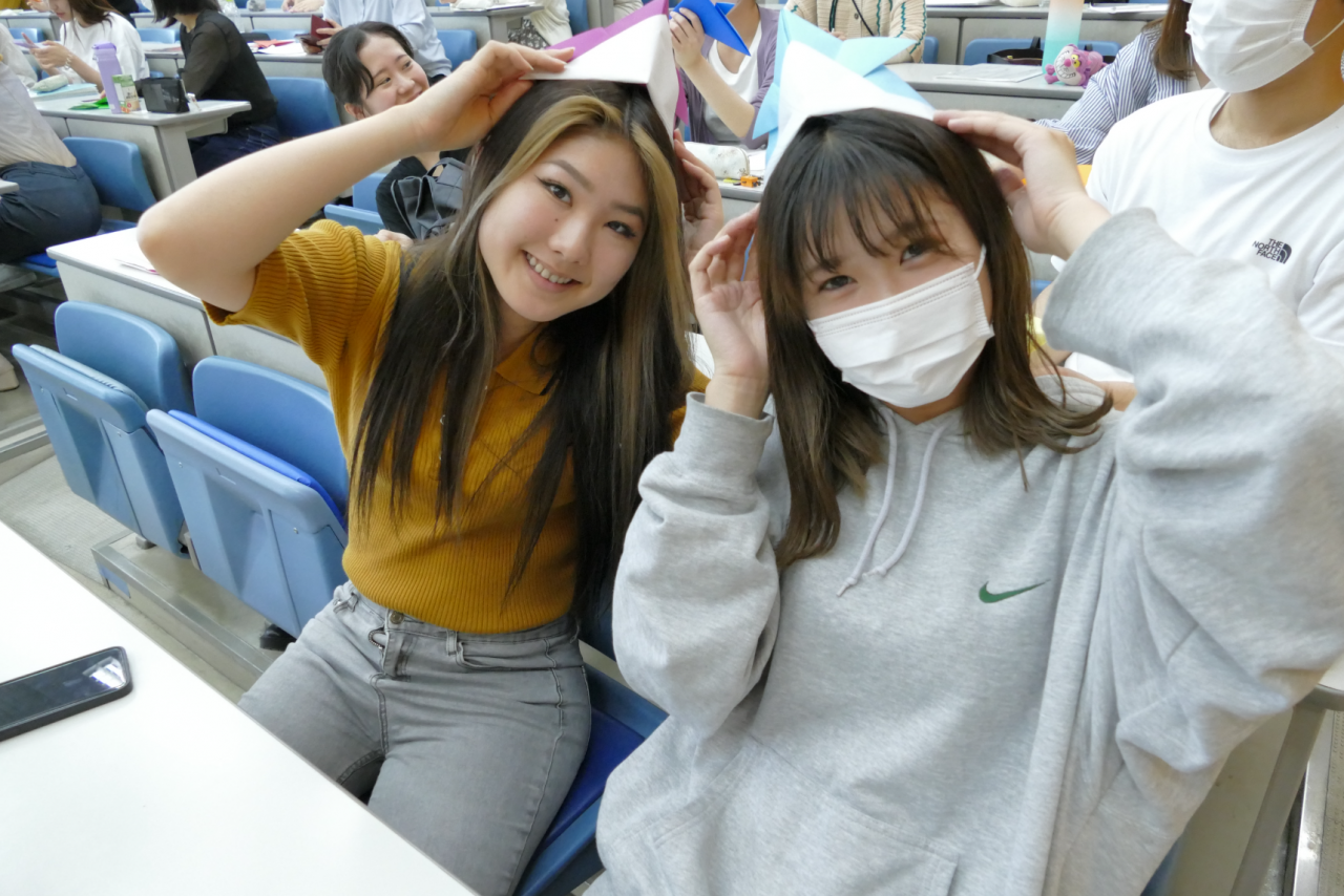 【こども教育学科】端午の節句にちなんで、大きな折り紙で「かぶと」を作りました