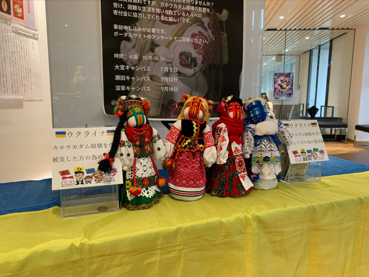 2023年7月5日(水)15:15-16:45、大宮キャンパスにて、本学で学んでいるウクライナ人留学生と、ウクライナの伝統的なお守り人形を制作するイベントを実施。ウクライナ人留学生4名が主催し、計16名の学生が参加しました。留学生が各テーブルに1人ずつ付き、テーブルごとに協力し合いながら、みんなで可愛らしい人形を作ることができました。カホウカダム崩壊の影響を受け、困難な生活を強いられている人々への寄付金も募っています。イベントに参加した学生は、グローバルパスポートのスタンプを得ることができます。