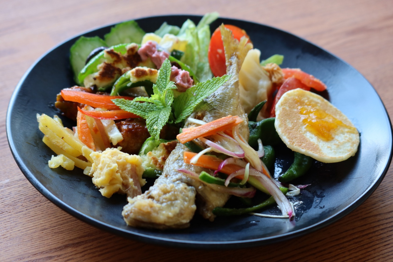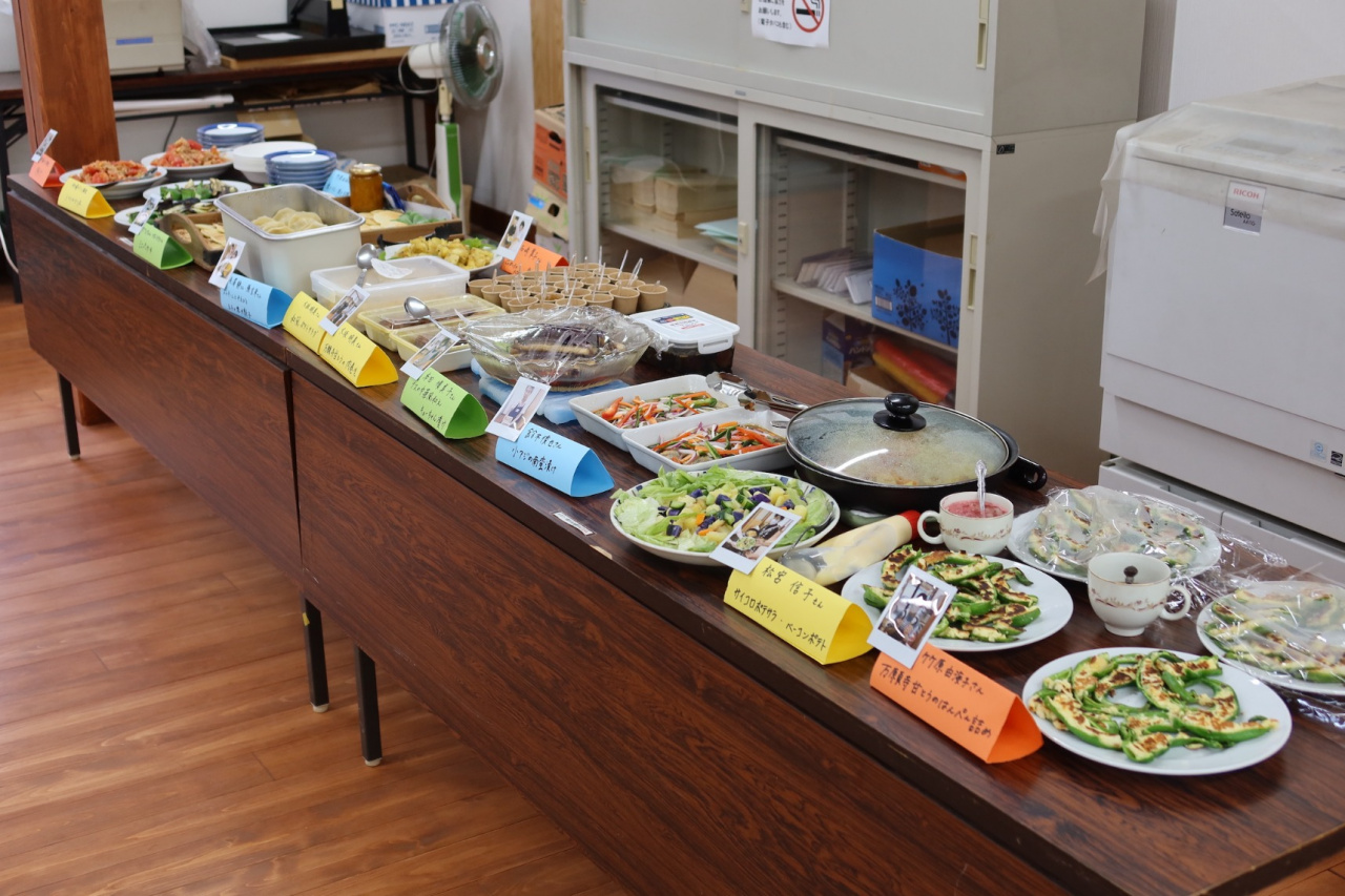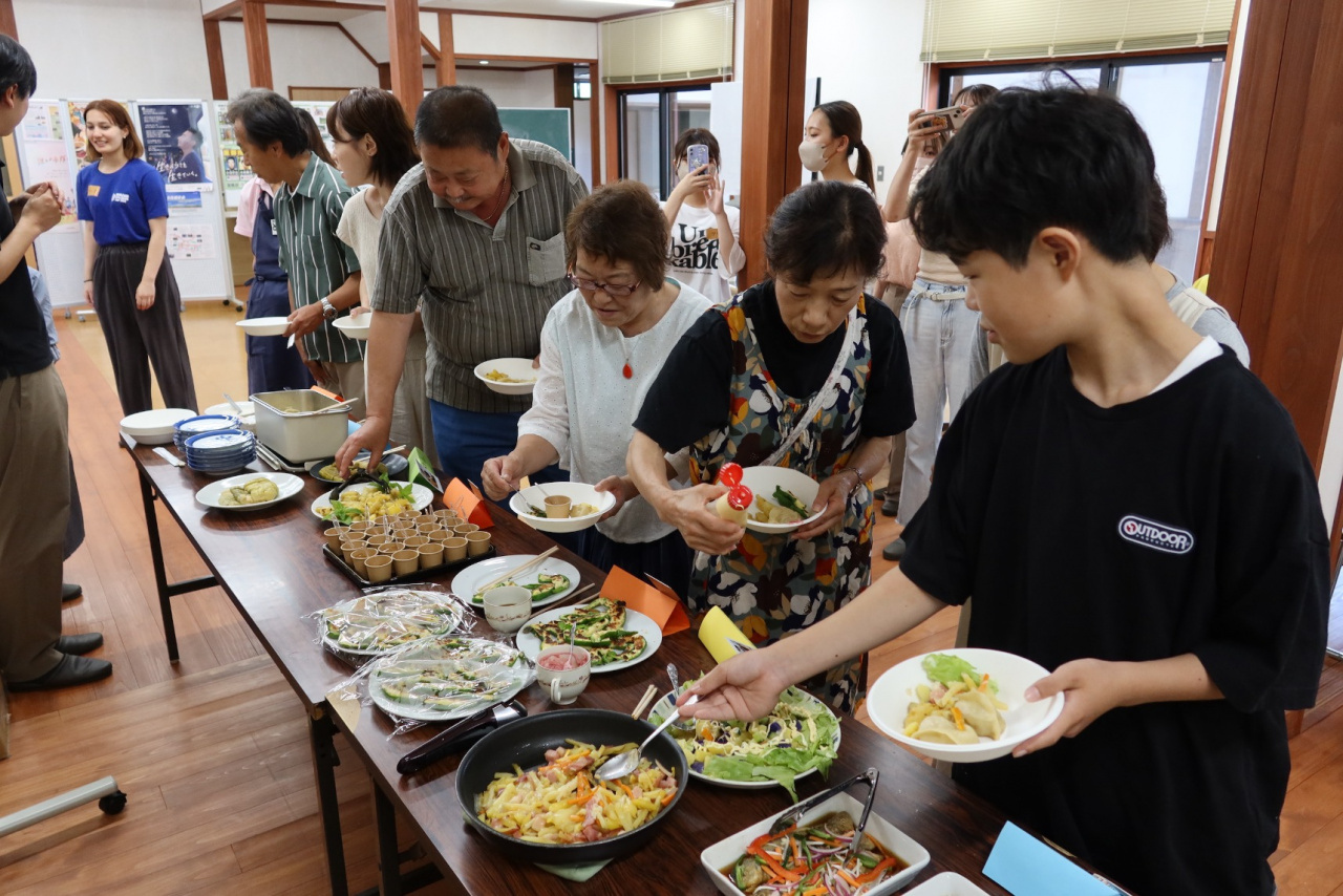 今回は、夏野菜を使った料理をテーマに地域住民の方に料理を持ち寄っていただく形で、事前に配布したチラシと志賀郷地域振興協議会のお声掛けにより、計15名の地域住民の方にご参加頂きました。料理の中には綾部市の郷土野菜を使った「万願寺甘とうがらしのはんぺん詰め」や「自家製奈良漬け」などが並び、私たちも「茄子の豚汁」、「トマトのマリネ」を提供しました。地産地消の魅力を見出すこれらの料理は、住民の方々にレシピをお聞きしてストックしており、最終的には、志賀郷のサステイナブル・レシピ集として取りまとめる予定です。
