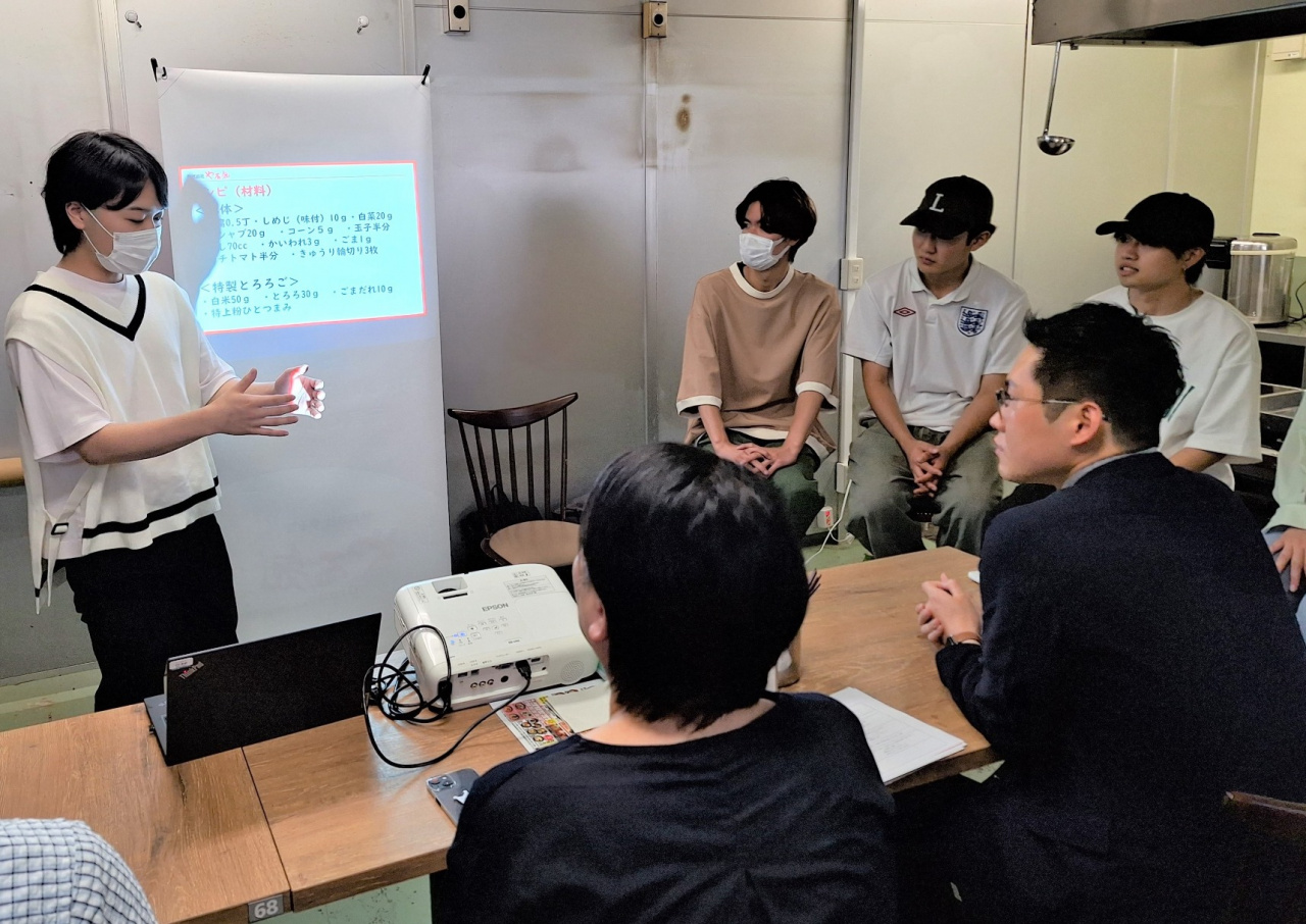 2023年度は3年生14名が2チームに分かれ、商品の構想、試作やレシピの作成、販売ターゲットやキャッチコピーを考案しました。その成果として、株式会社やる気大島社長ほか社員の皆さんの前で新商品のプレゼンテーションを実施し、「冷製スン豆腐」の発売が決定しました。