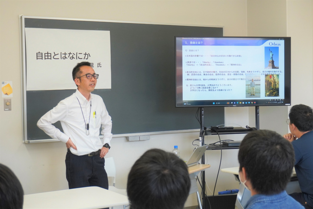 2023.07.19 森光 龍氏(本学法科大学院修了生)による講演会を開催【法学部】 6月14日(水)、本学法科大学院修了生の森光 龍 氏を講師に招き、「自由とはなにか」をテーマに、赤池 一将教授の「基礎演習」受講生を対象に講演会を開催しました。 企業法務で働く実体験をお伝えいただき、法律学の基礎にある「自由」のとらえ方と、今後の学生生活とキャリア形成のあり方について考える機会となりました。