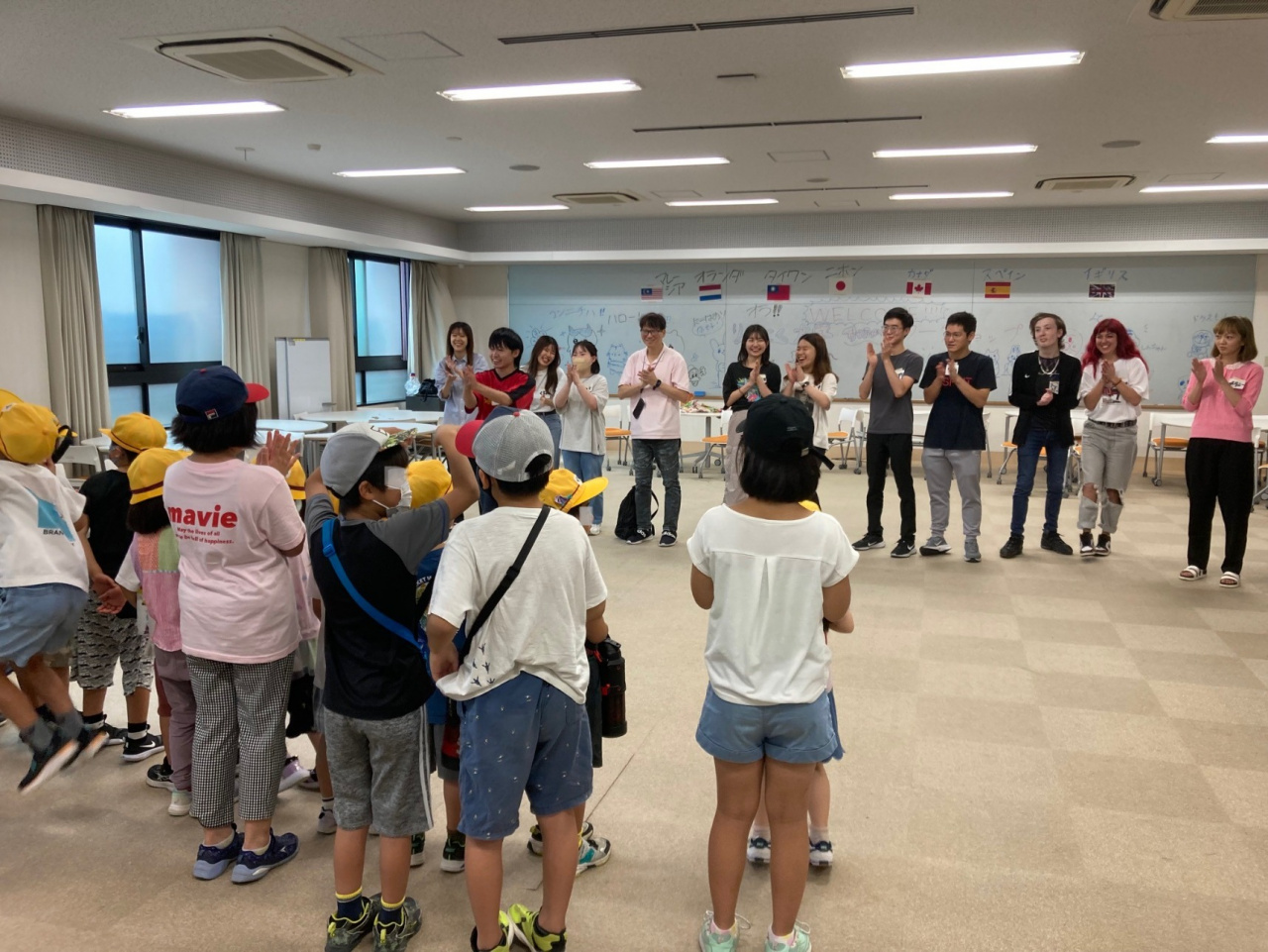 ワークショップがスムーズに進行し、最後に児童たちに初めに説明した「ワークショップでの目標」について、実際にワークショップを経験してどう感じたかを尋ねた。すると、「外国に行きたくなった」や、「外国のあいさつや英語が面白かった」などの前向きな意見ばかりが挙がった。短期留学生たちも「かわいかった」、「大変だったが楽しく、日本人と協力することで成功できてうれしい」という意見が挙がった。