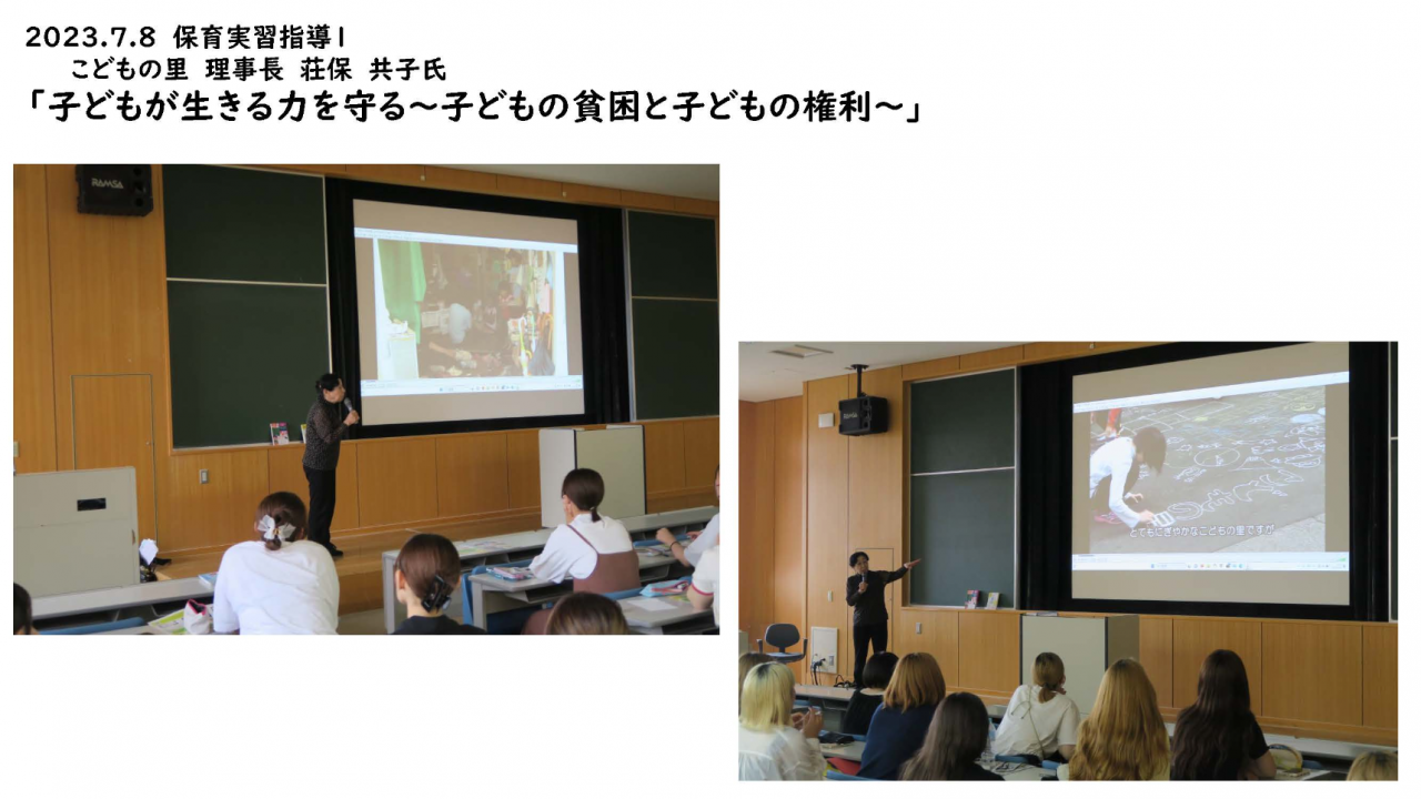 1年生の実習指導科目「保育実習指導Ⅰ」において、子どもの育つ多様な環境を理解する取り組みとして、認定NPO法人 こどもの里館長・理事長の荘保共子氏(本学客員教授)の講演会を開催しました。