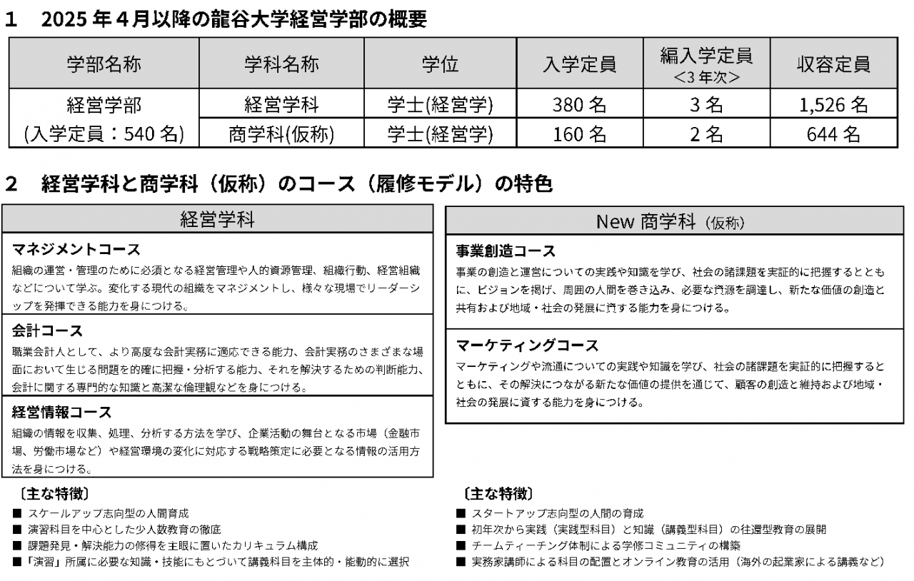 本学は既に、2025年4月、社会学部を改組し、瀬田キャンパスから深草キャンパスに移転させる構想を発表しています。これと同時期に経営学部に商学科(仮称)を設置し2学科制とする予定です。